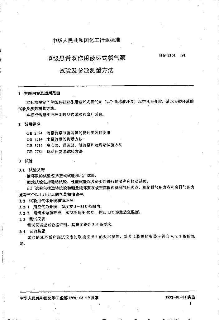 HG 2101-1991 单级悬臂双作用液环式氯气泵试验及参数测量方法