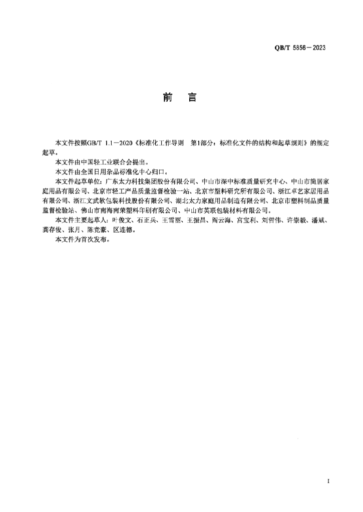 广东太力科技集团股份有限公司、中山市深中标准质量研究中心、中山市简居家庭用品有限公司、北京市轻工产品质量监督检验一站、北京市塑料研究所有限公司、浙江卓艺家居用品有限公司、浙江文武软包装科技股份有限公司、湖北太力家庭用品制造有限公司、北京市塑料制品质量监督检验站、佛山市南海南荣塑料印刷有限公司、中山市英联包装材料有限公司