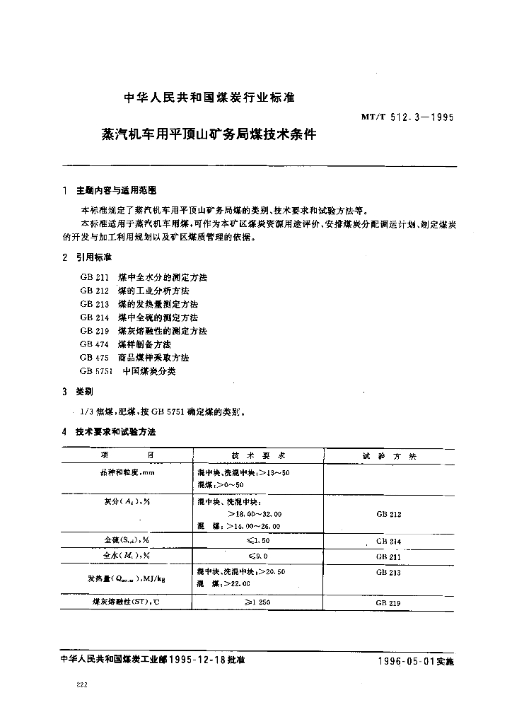 MT/T 512.3-1995 蒸汽机车用平顶山矿务局煤技术条件