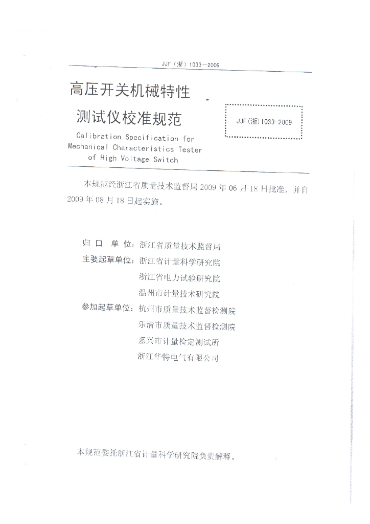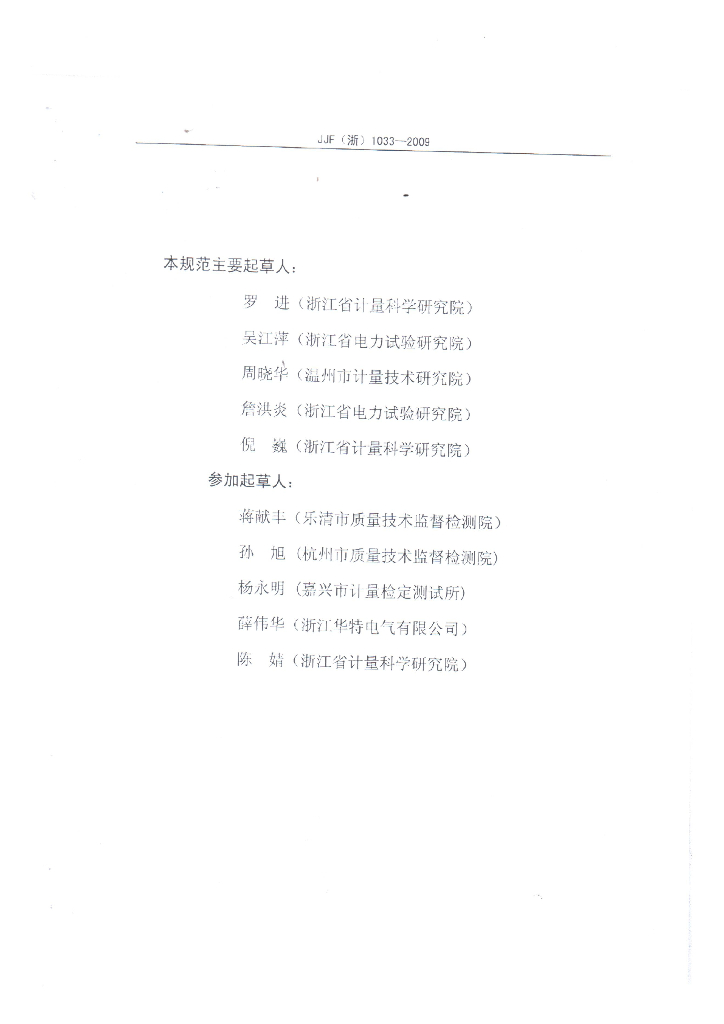 罗进(浙江省计量科学研究院)、吴江萍(浙江省电力试验研究院)、周晓华(温州市计量技术研究院)、詹洪炎(浙江省电力试验研究院)、倪巍(浙江省计量科学研究院)、蒋献丰(乐清市质量技术监督检测院)、孙旭(杭州市质量技术监督检测院)、杨永明(嘉兴市计量检定测试所)、薛伟华(浙江华特电气有限公司)、陈婧(浙江省计量科学研究院)