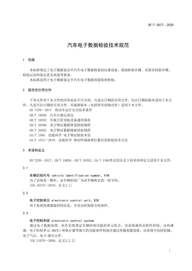 SF/T 0077-2020 汽车电子数据检验技术规范