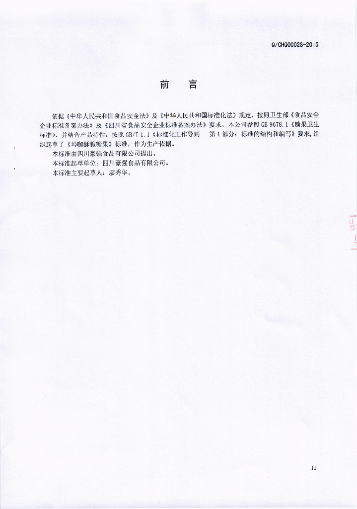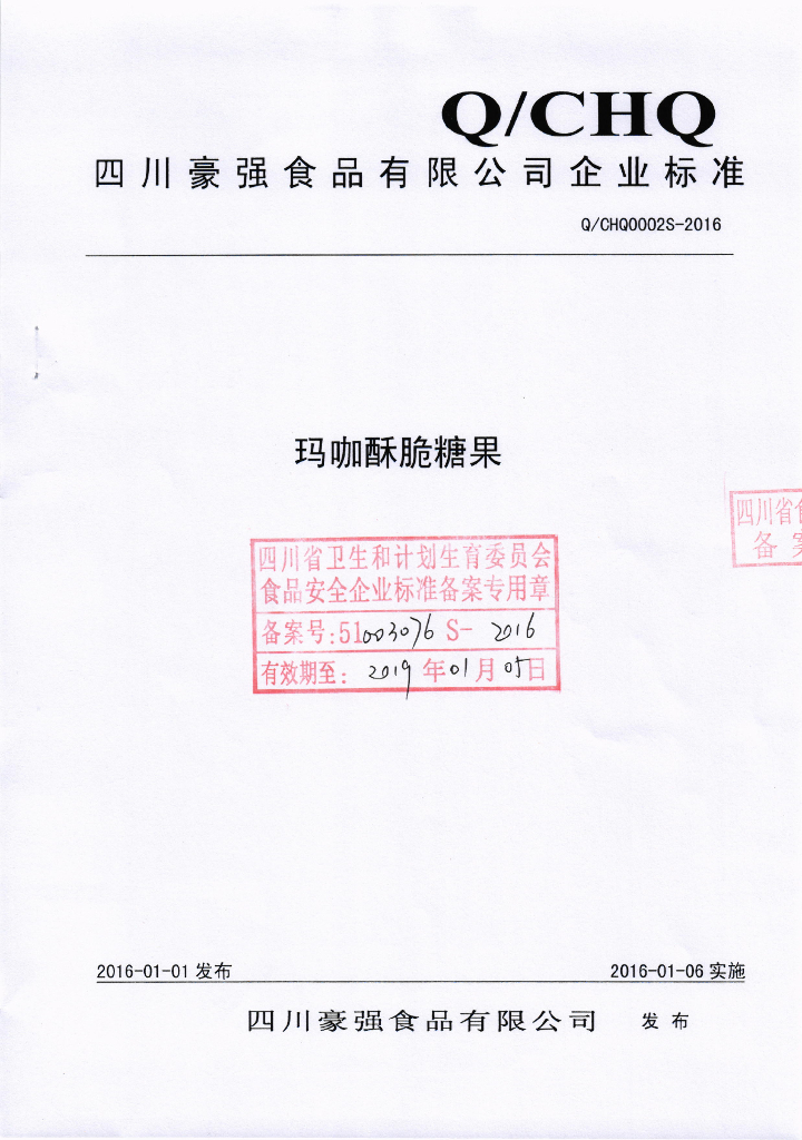 Q/CHQ 0002S-2016 四川豪强食品有限公司 玛咖酥脆糖果