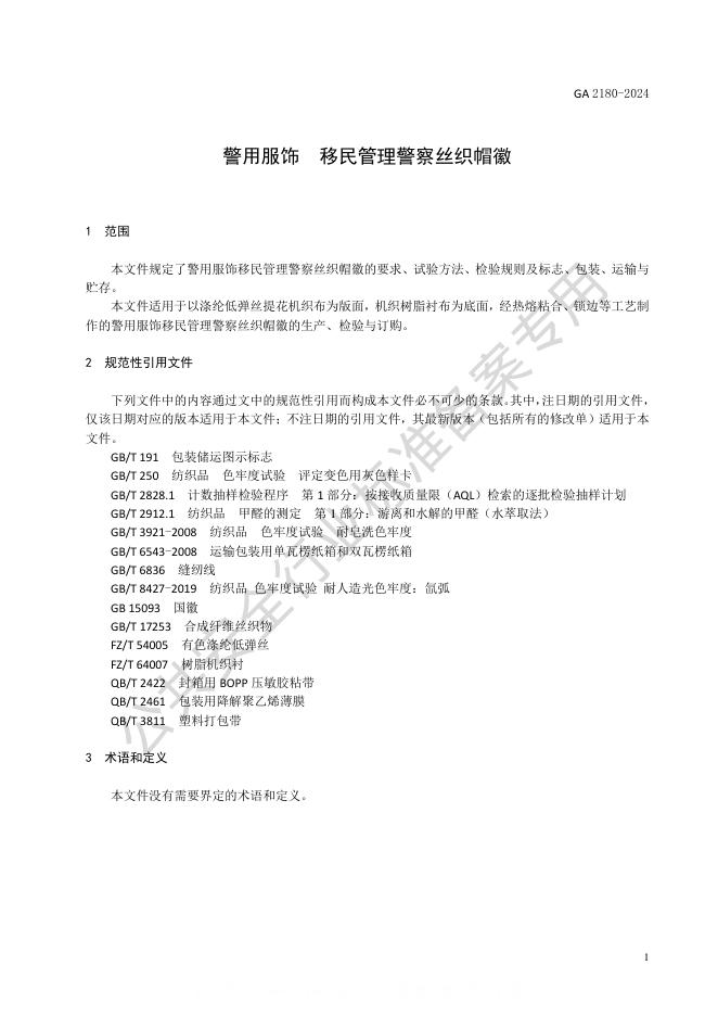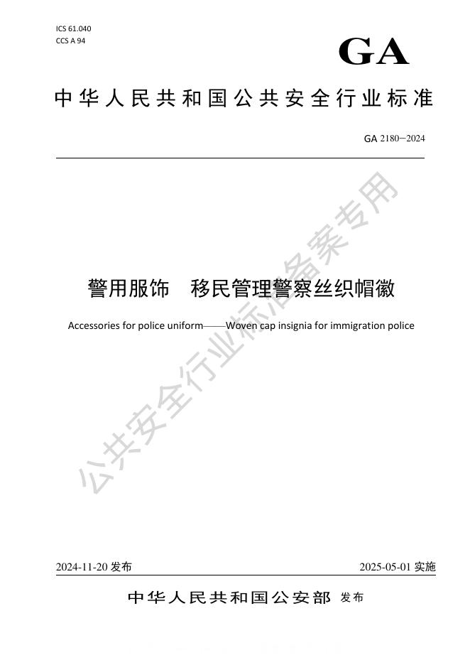 GA 2180-2024 警用服饰 移民管理警察丝织帽徽(摘要版)