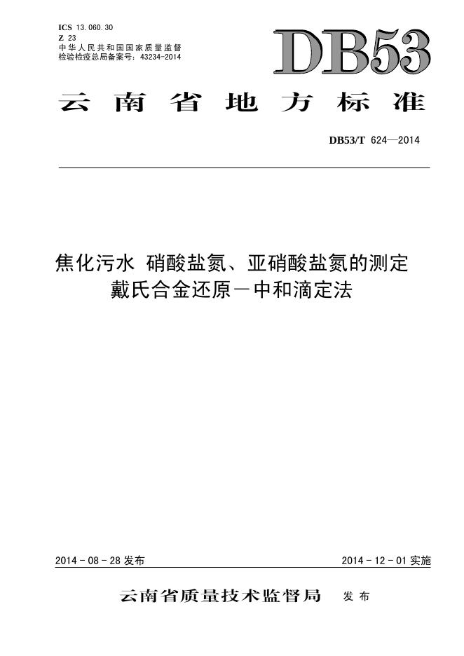 DB53/T 624-2014 焦化污水 硝酸盐氮、亚硝酸盐氮的测定 戴氏合金还原-中和滴定法