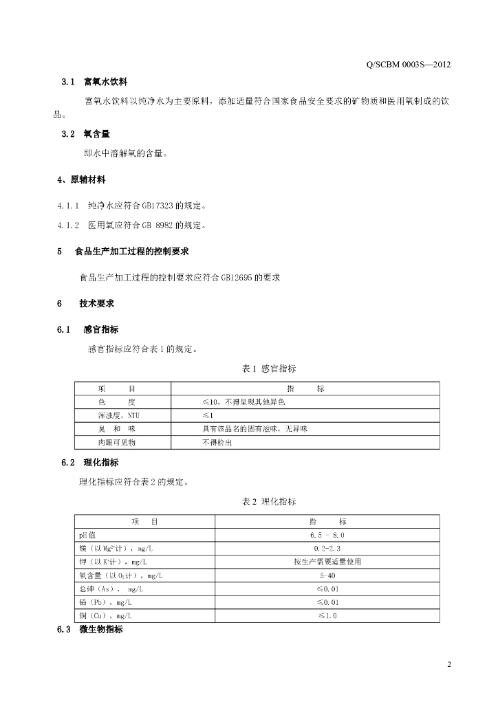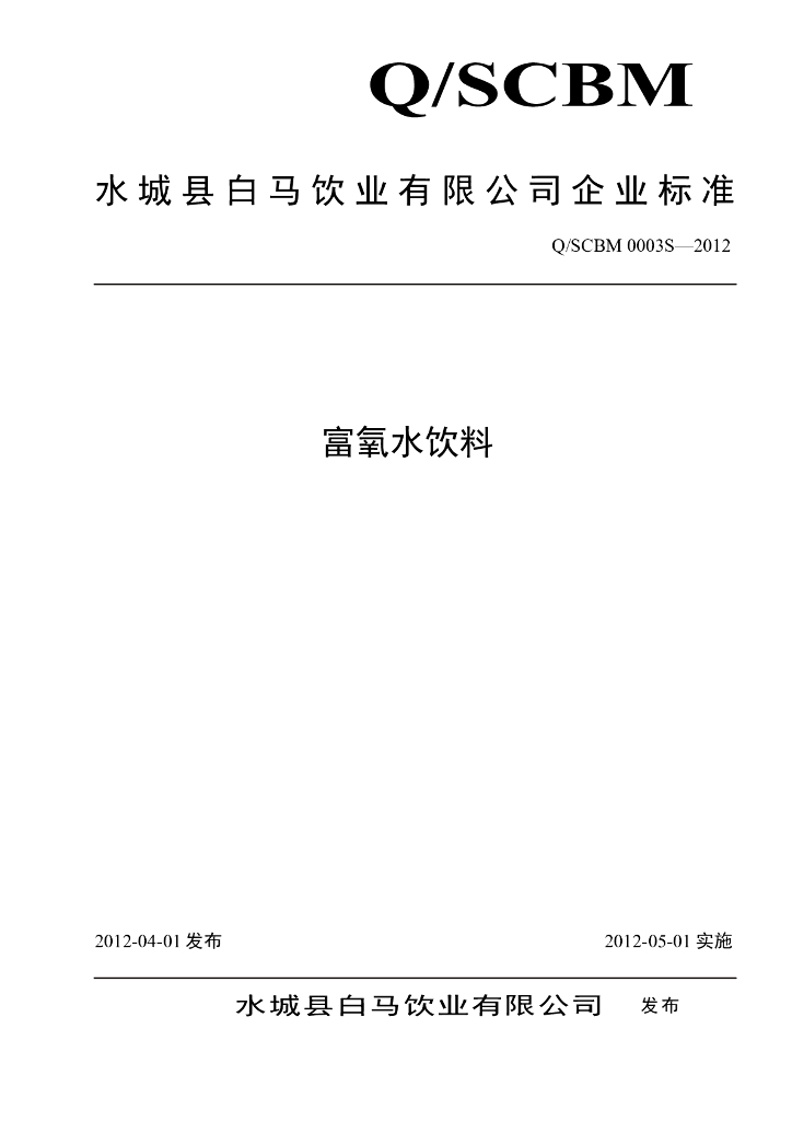 Q/SCBM 0003S-2012 水城县白马饮业有限公司 富氧水饮料