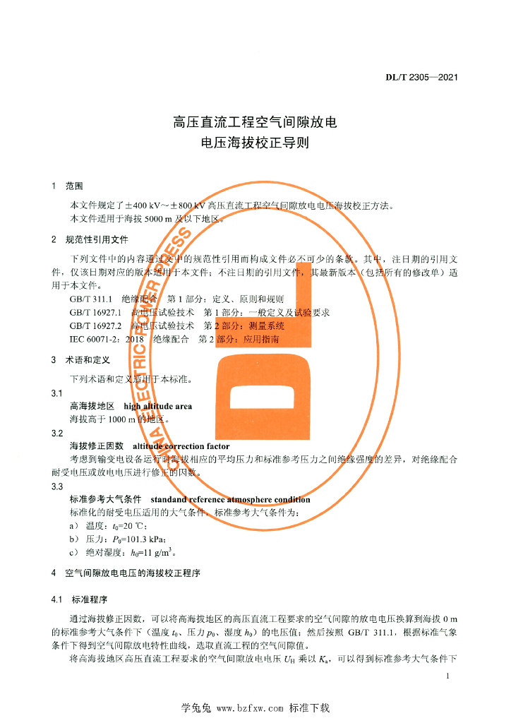 DL/T 2305-2021 高压直流工程空气间隙放电电压海拔校正导则