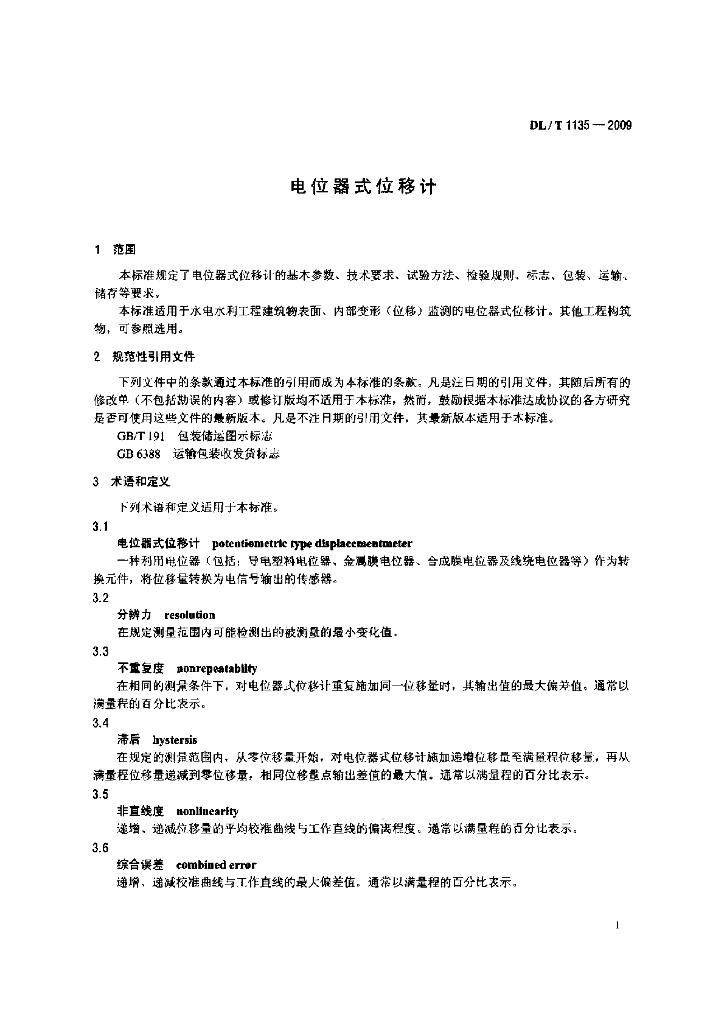 DL/T 1135-2009 电位器式位移计