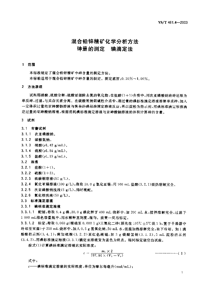 YS/T 461.4-2003 混合铅锌精矿化学分析方法砷量的测定碘滴定法