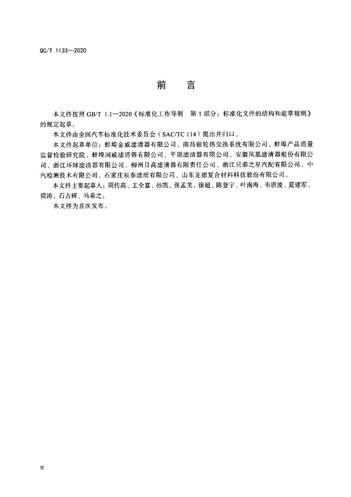 QC/T 1133-2020 商用汽车空气滤清器安全滤芯