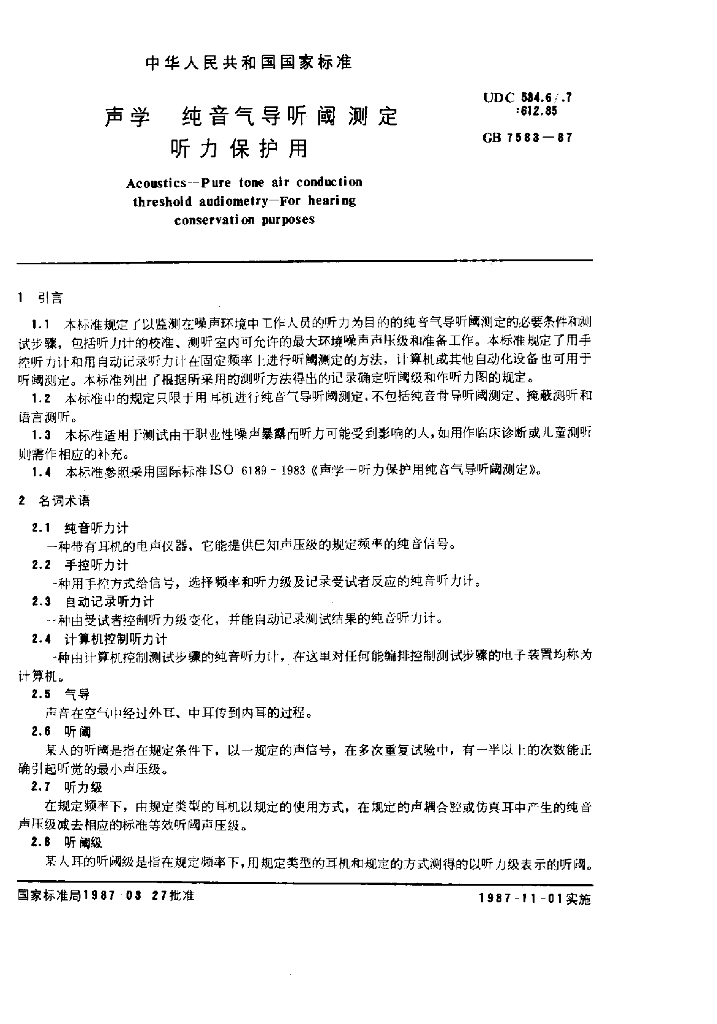 GB/T 7583-1987 声学 纯音气导听阈测定 听力保护用