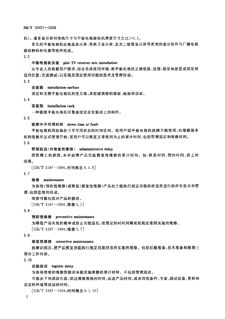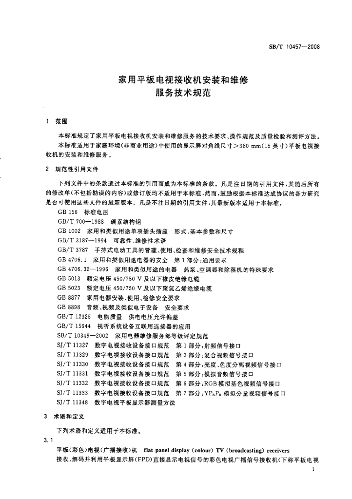 SB/T 10457-2008 家用平板电视接收机安装和维修服务技术规范