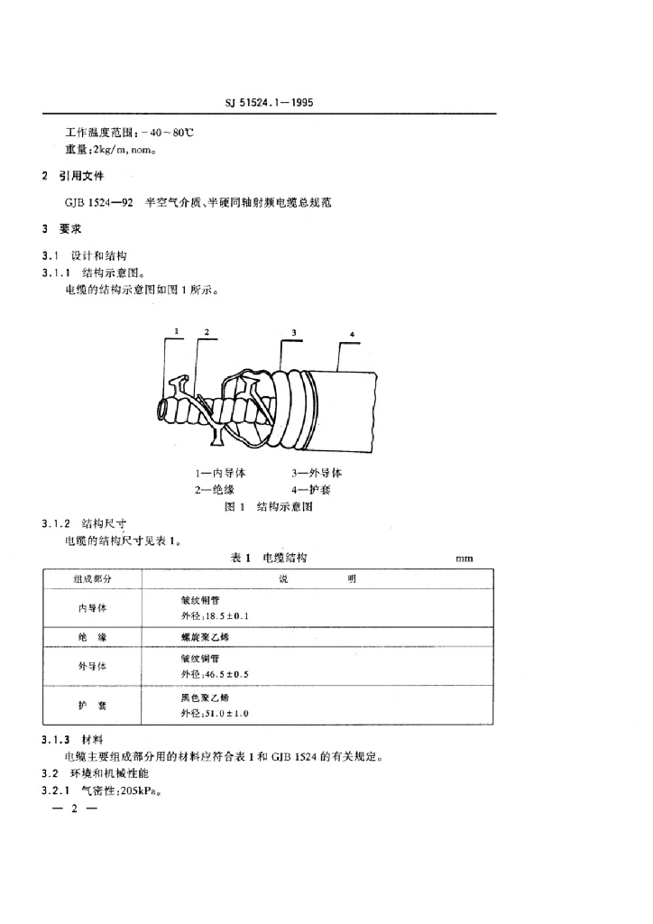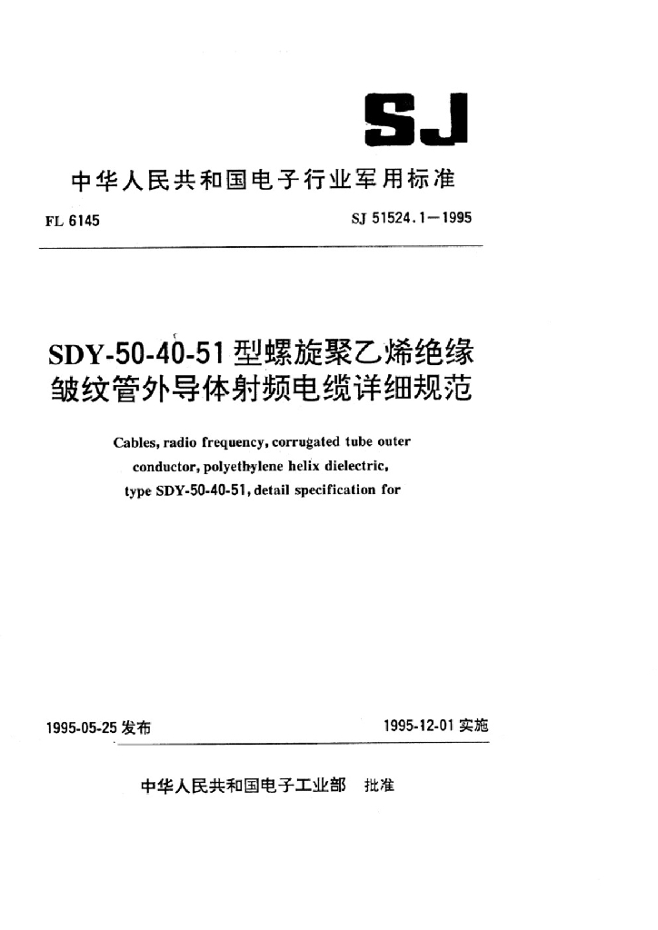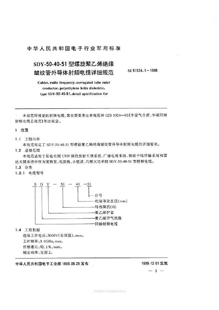 SJ 51524.1-1995 SDY-50-40-51型螺旋聚乙烯绝缘皱纹管外导体射频电缆详细规范