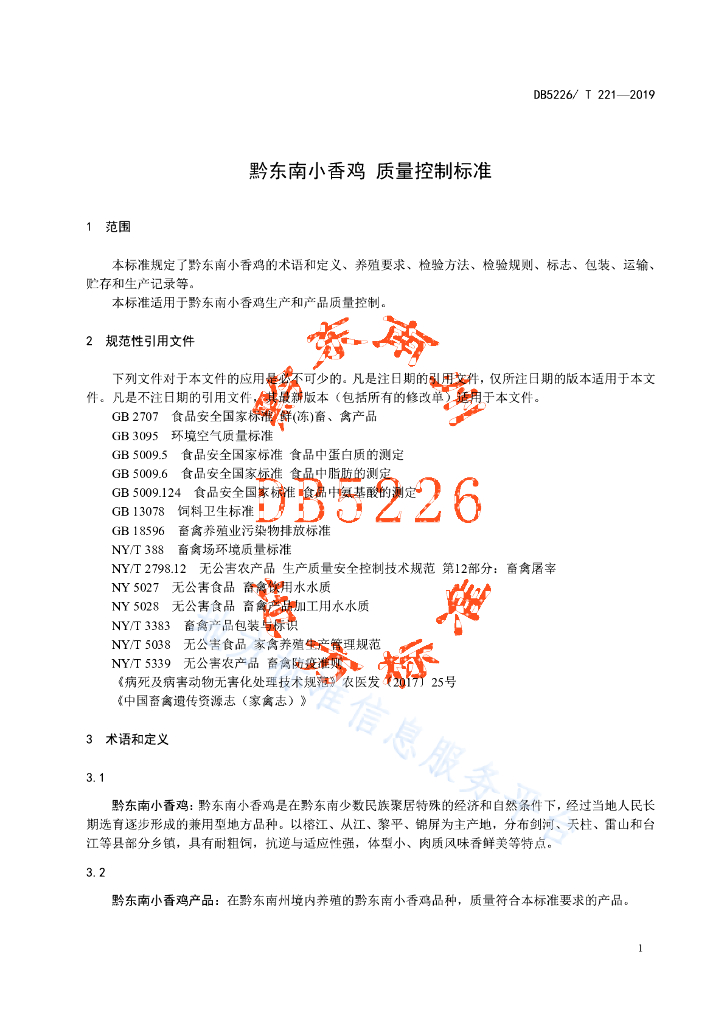 DB5226/T 221-2019 黔东南小香鸡 质量控制标准