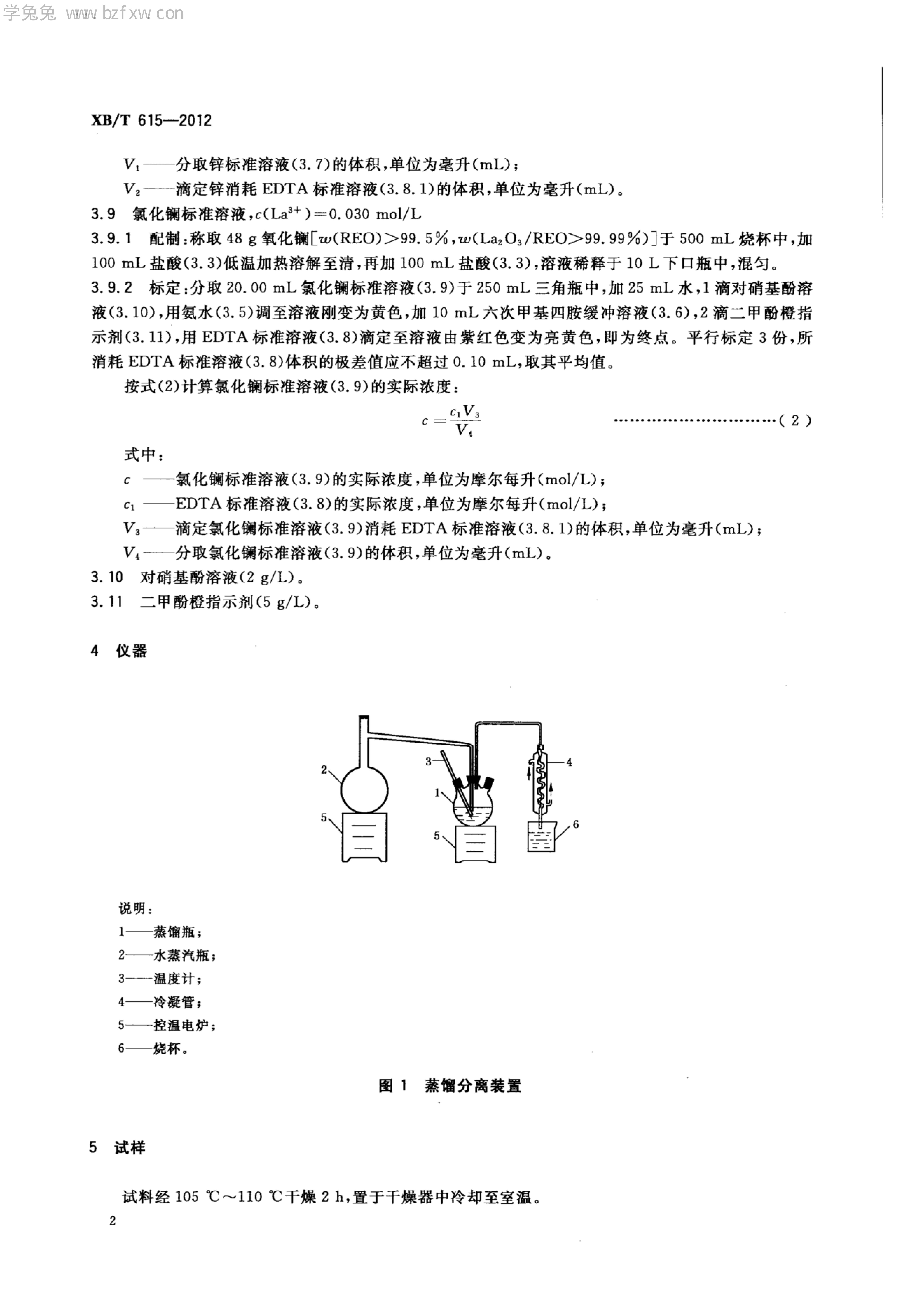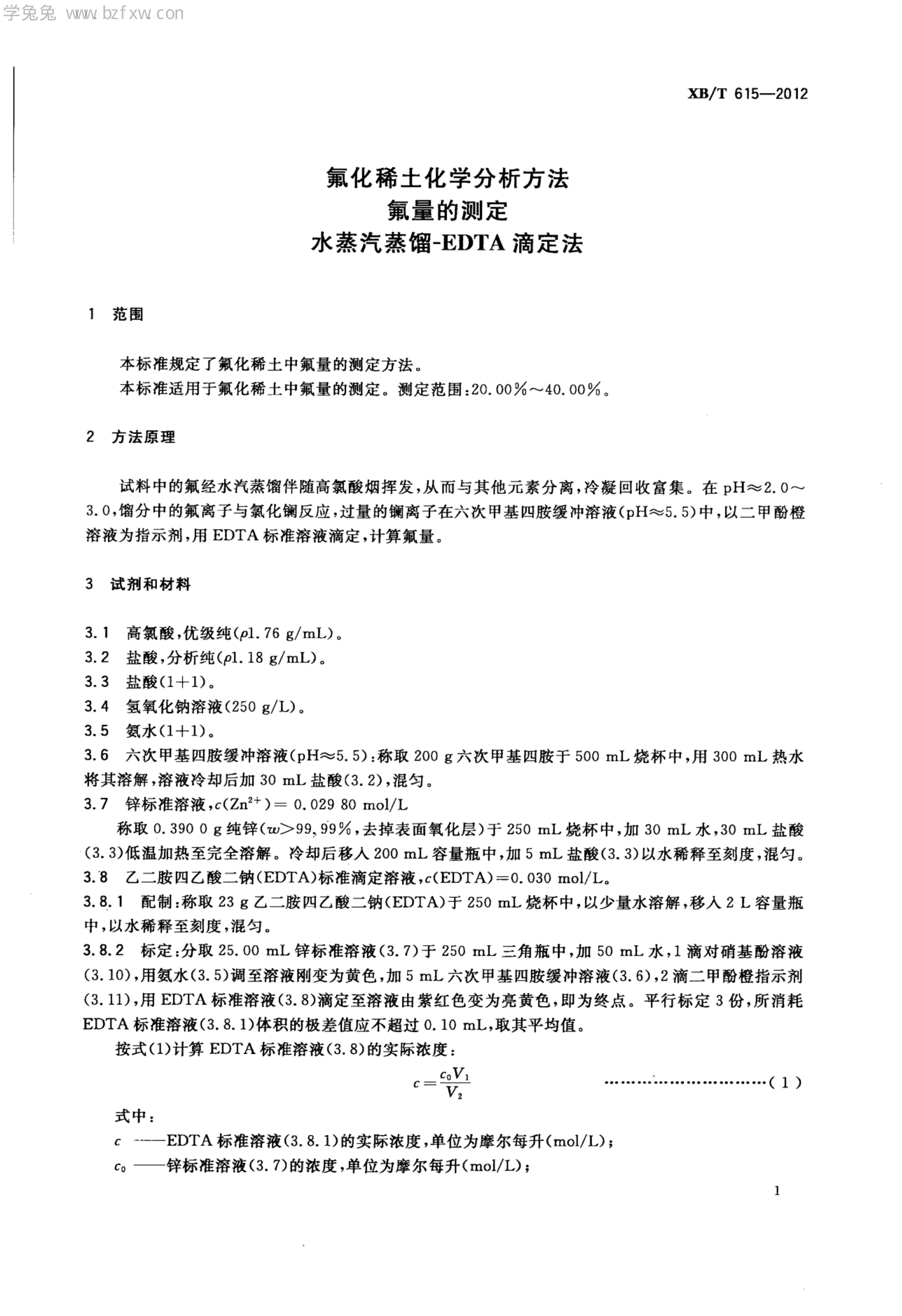 XB/T 615-2012 氟化稀土化学分析方法 氟量的测定 水蒸汽蒸馏-EDTA滴定法