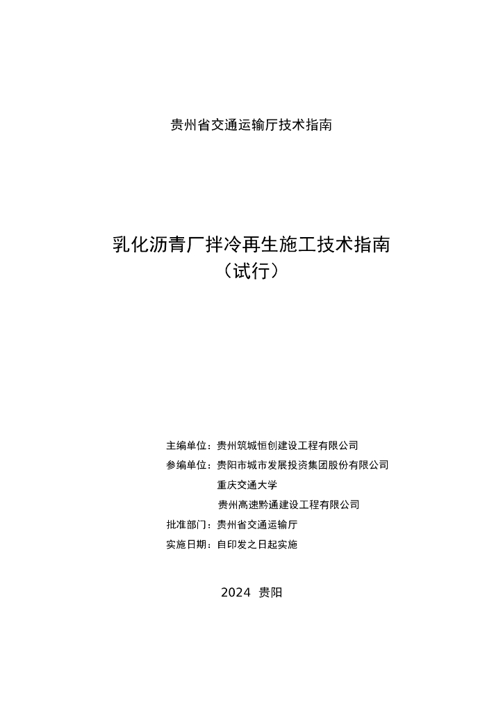 JTZN52/T 10-2024 乳化沥青厂拌冷再生施工技术指南(试行)