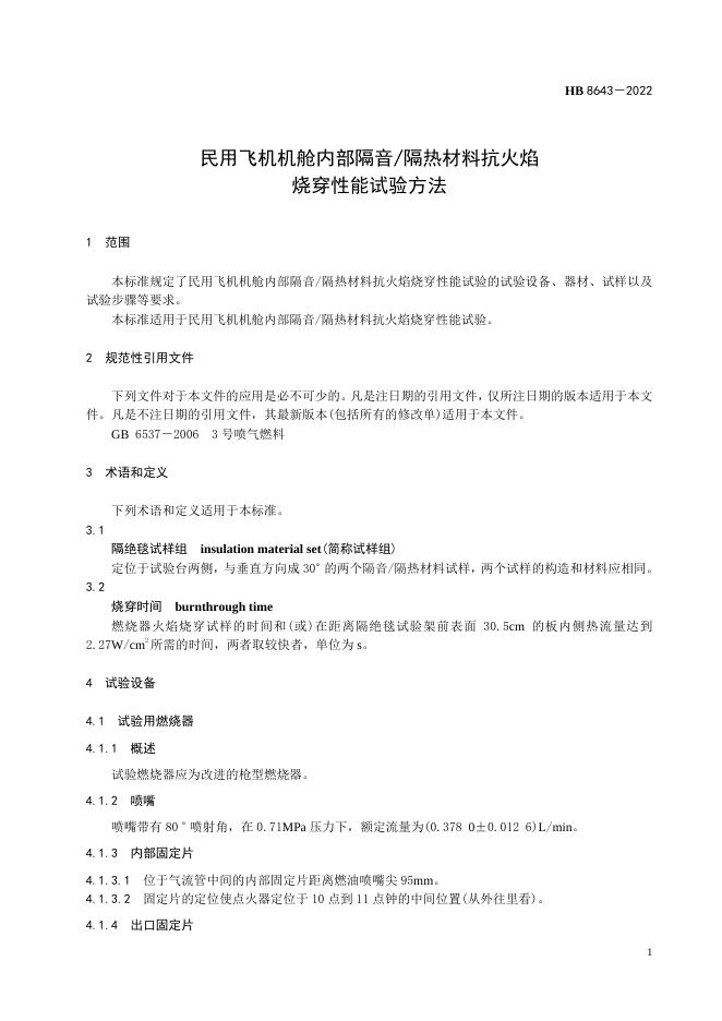 HB 8643-2022 民用飞机机舱内部隔音/隔热材料抗火焰烧穿性能试验方法