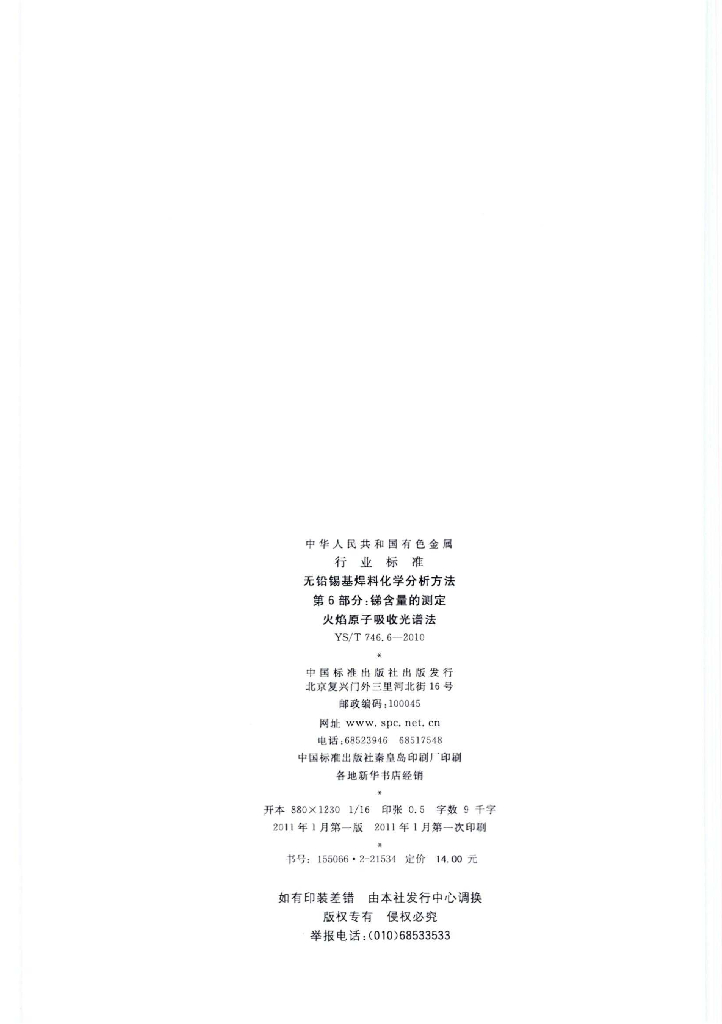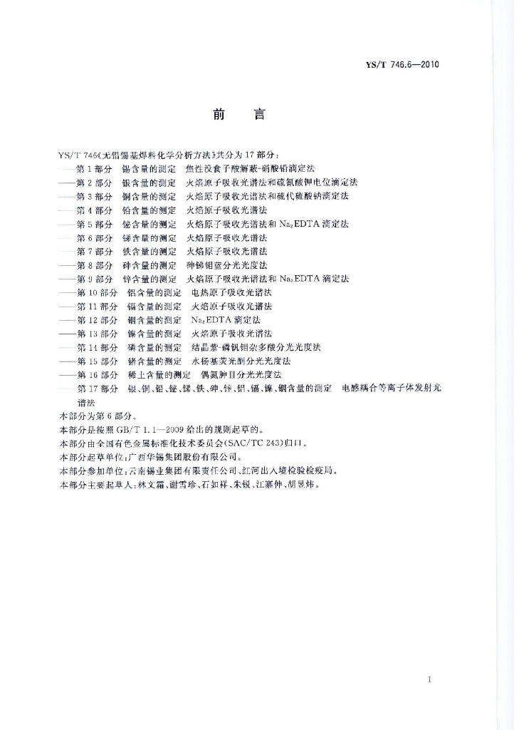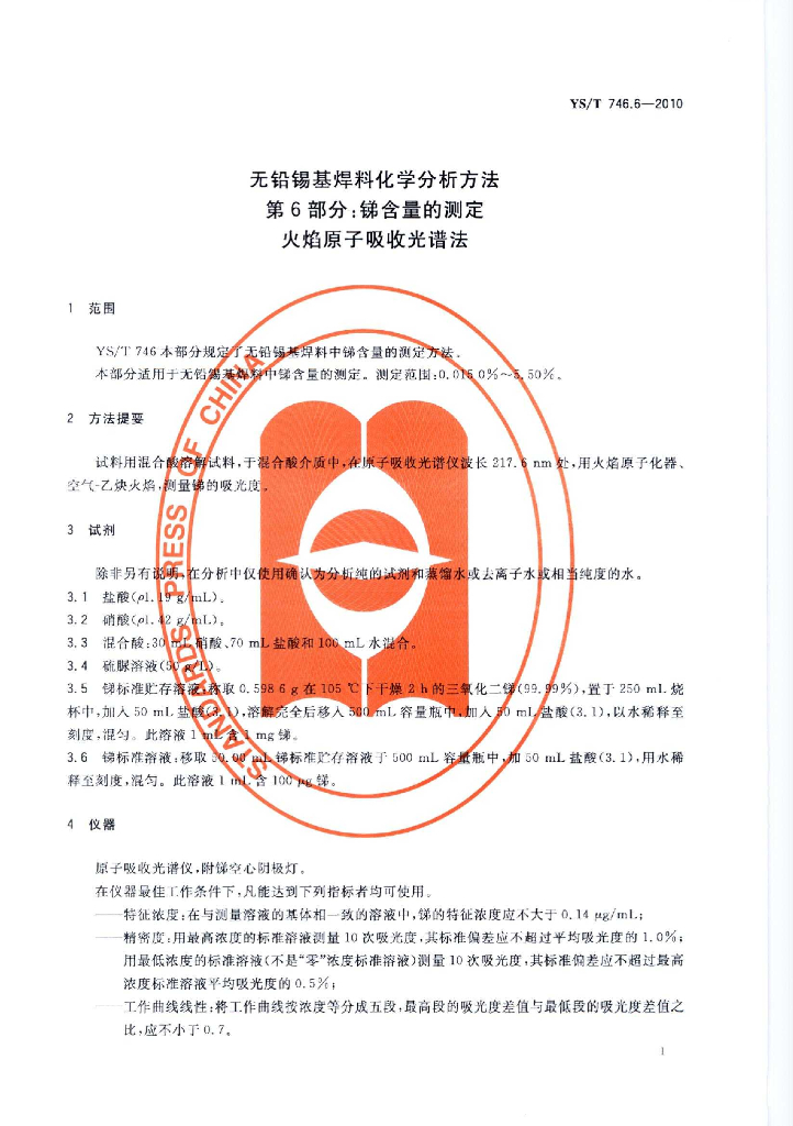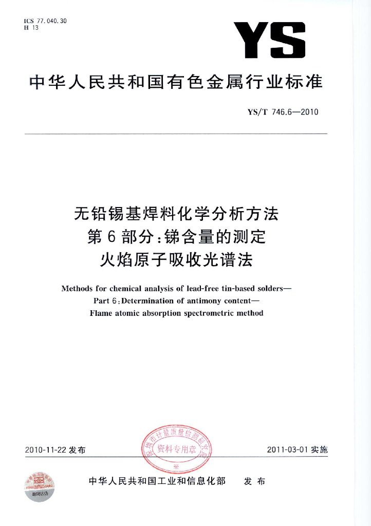 YS/T 746.6-2010 无铅锡基焊料化学分析方法 第6部分:锑含量的测定 火焰原子吸收光谱法