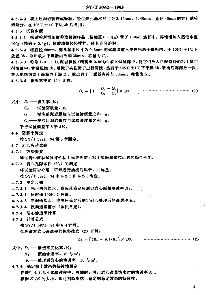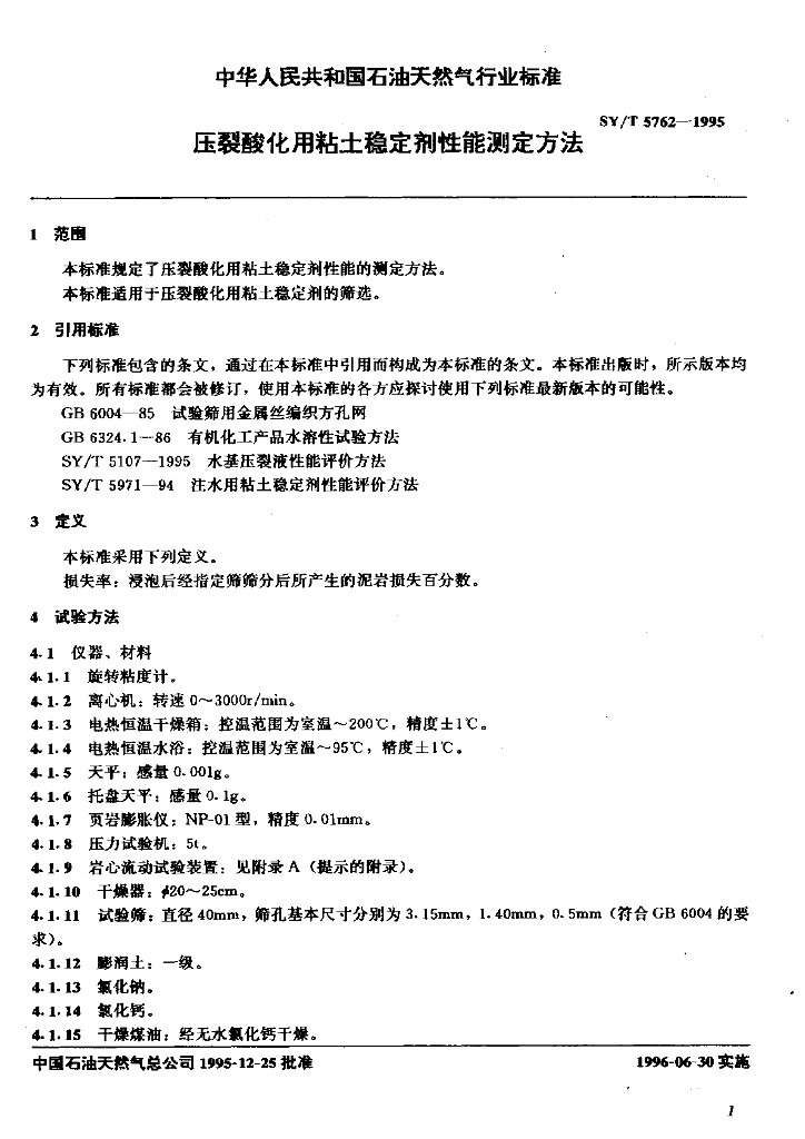 SY/T 5762-1995 压裂酸化用粘土稳定剂性能测定方法