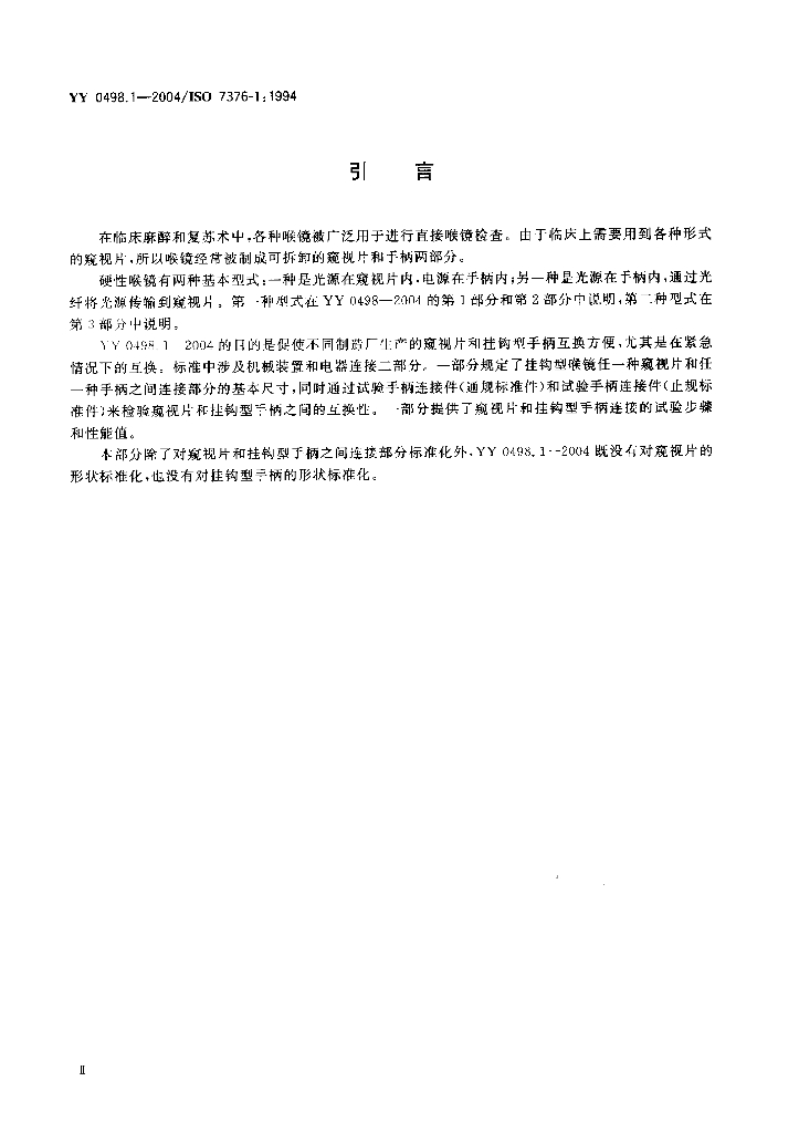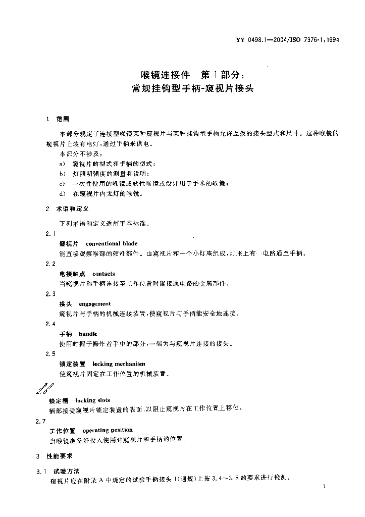 YY 0498.1-2004/ISO 7376-1: 1994 喉镜连接件 第1部分:常规挂钩型手柄-窥视片接头