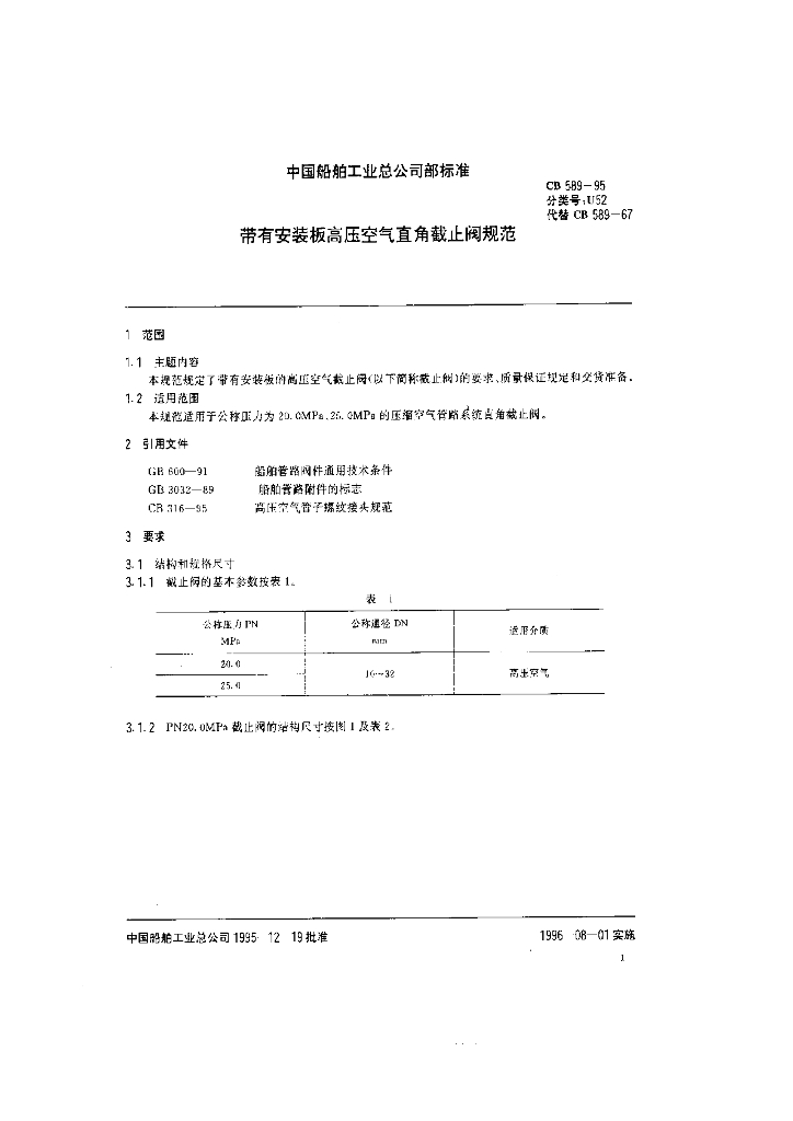CB 589-1995 带有安装板高压空气直角截止阀规范