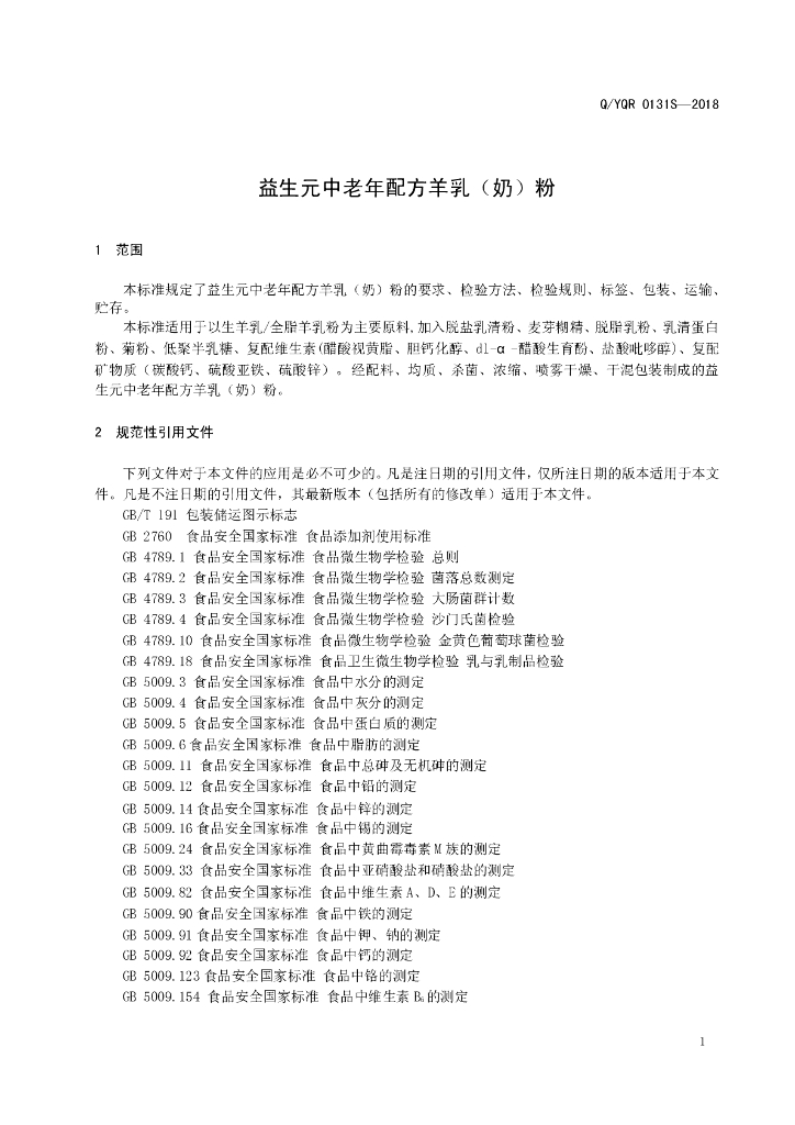 Q/YQR 0131S-2018 益生元中老年配方羊乳(奶)粉