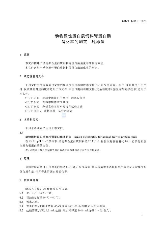 GB/T 17811-2025 动物源性蛋白质饲料胃蛋白酶消化率的测定 过滤法