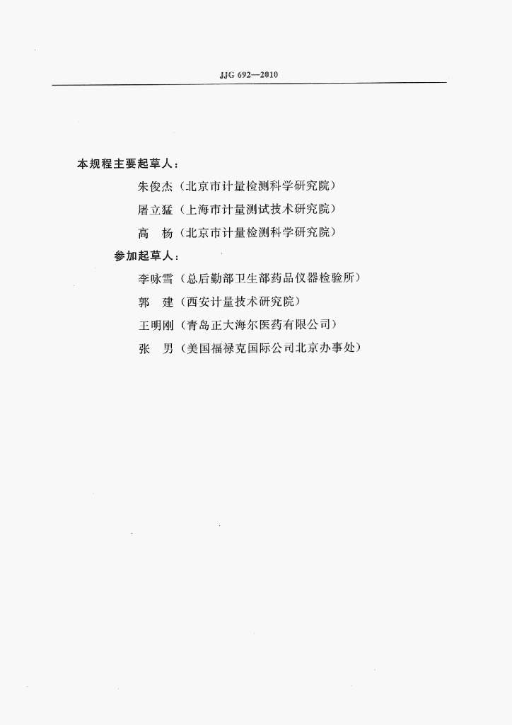 朱俊杰(北京市计量检测科学研究院)、屠立猛(上海市计量测试技术研究院)、高杨(北京市计量检测科学研究院)、李咏雪(总后勤部卫生部药品仪器检验所)、郭建(西安计量技术研究院)、王明刚(青岛正大海尔医药有限公司)、张男(美国福禄克国际公司北京办事处)