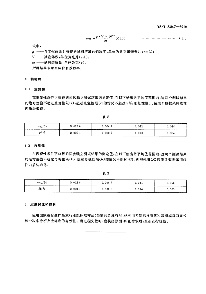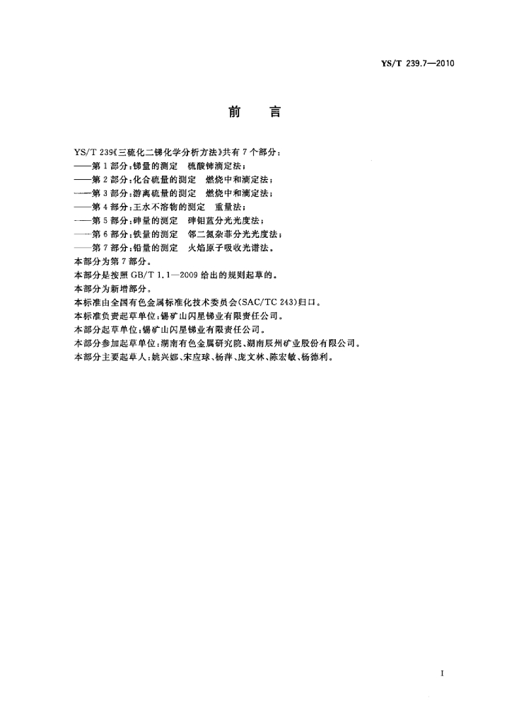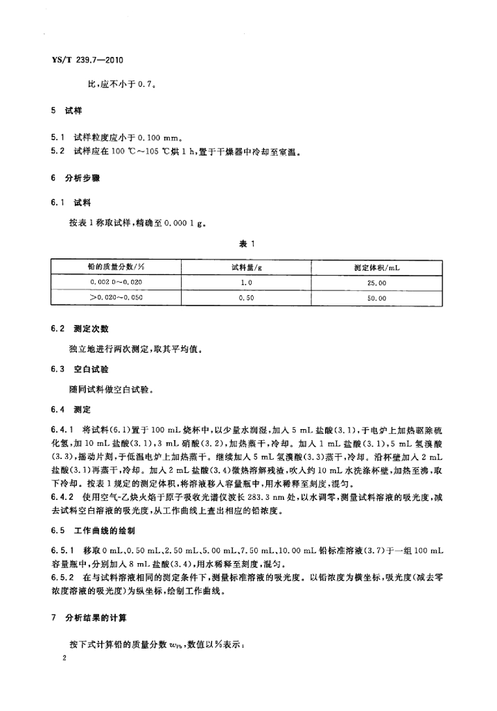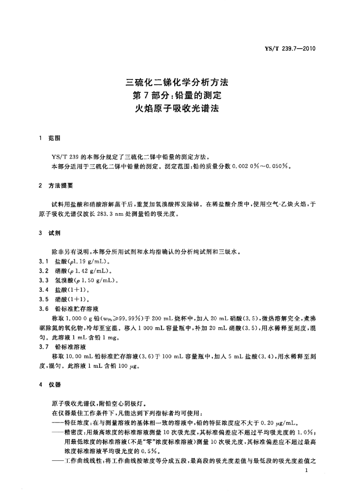 YS/T 239.7-2010 三硫化二锑化学分析方法 第7部分:铅量的测定火焰原子吸收光谱法