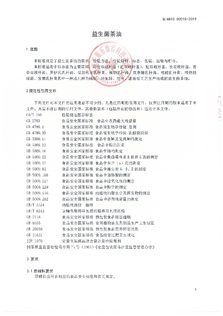 Q/ANTG 0001S-2019 益生菌茶油