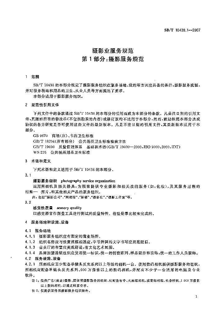 SB/T 10438.1-2007 摄影业服务规范 第1部分 摄影服务规范
