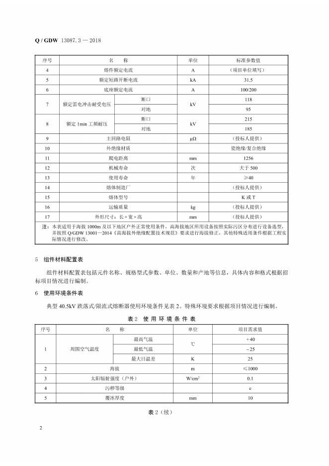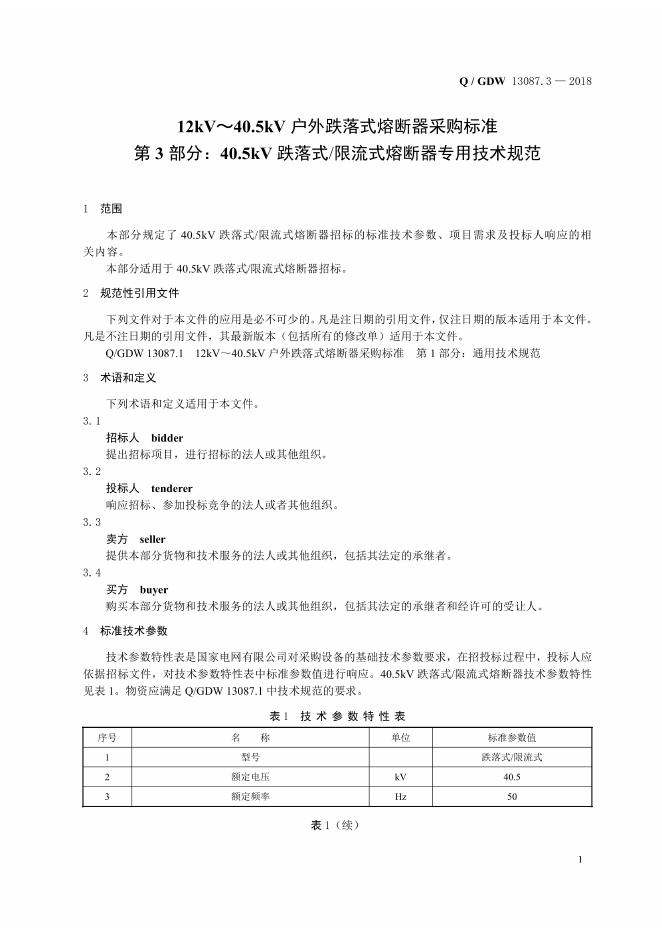 Q/GDW 13087.3-2018 12kV~40.5kV 户外跌落式熔断器采购标准 第3部分:40.5kV跌落式限流式熔断器专用技术规范