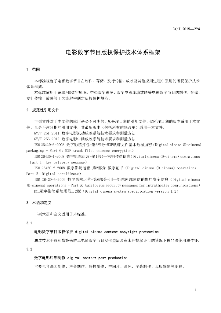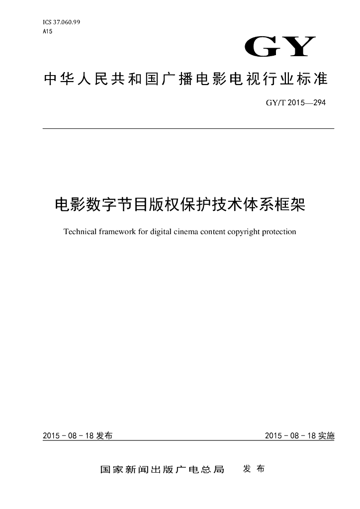GY/T 294-2015 电影数字节目版权保护技术体系框架