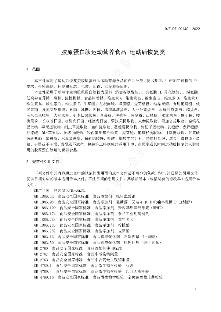 Q/FJDZ 0014S-2022 胶原蛋白肽运动营养食品 运动后恢复类