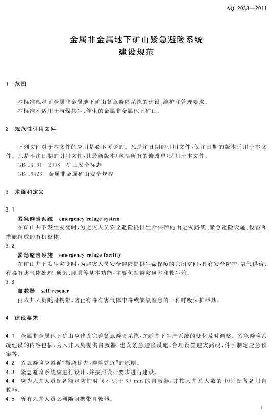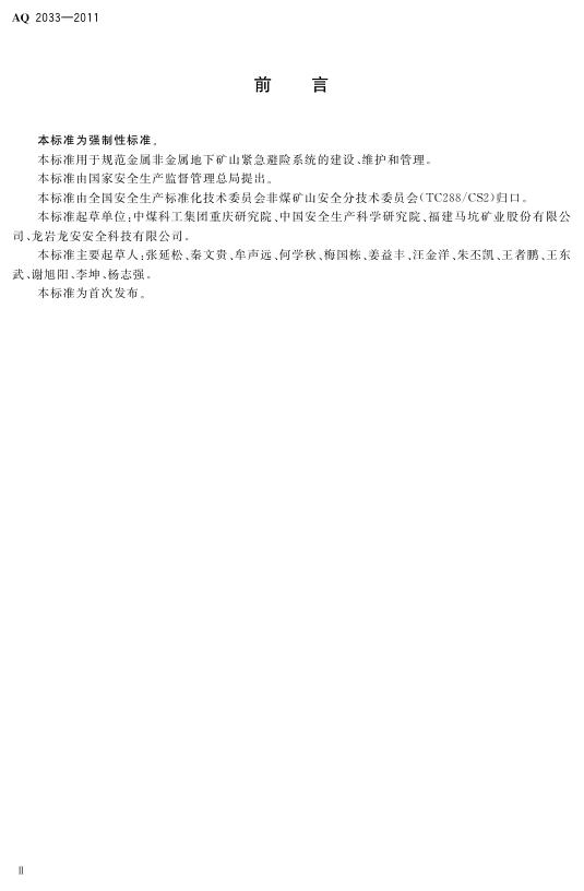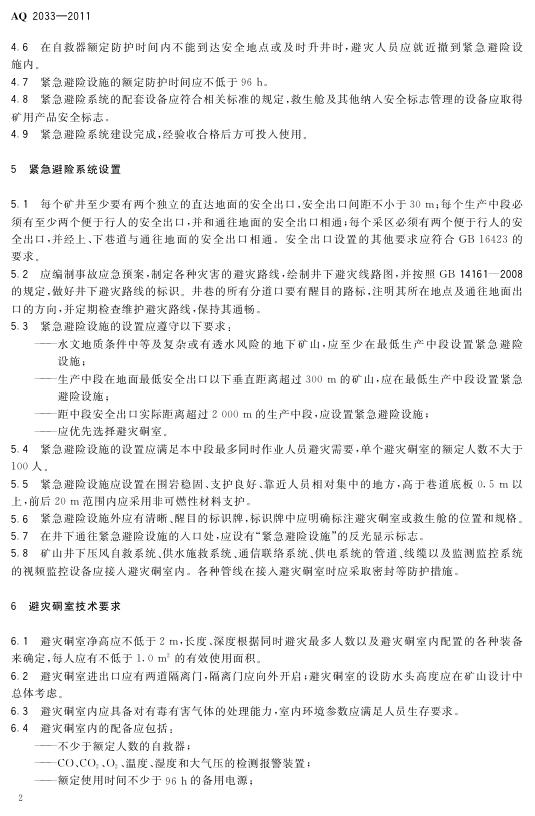 AQ 2033-2011 金属非金属地下矿山紧急避险系统建设规范