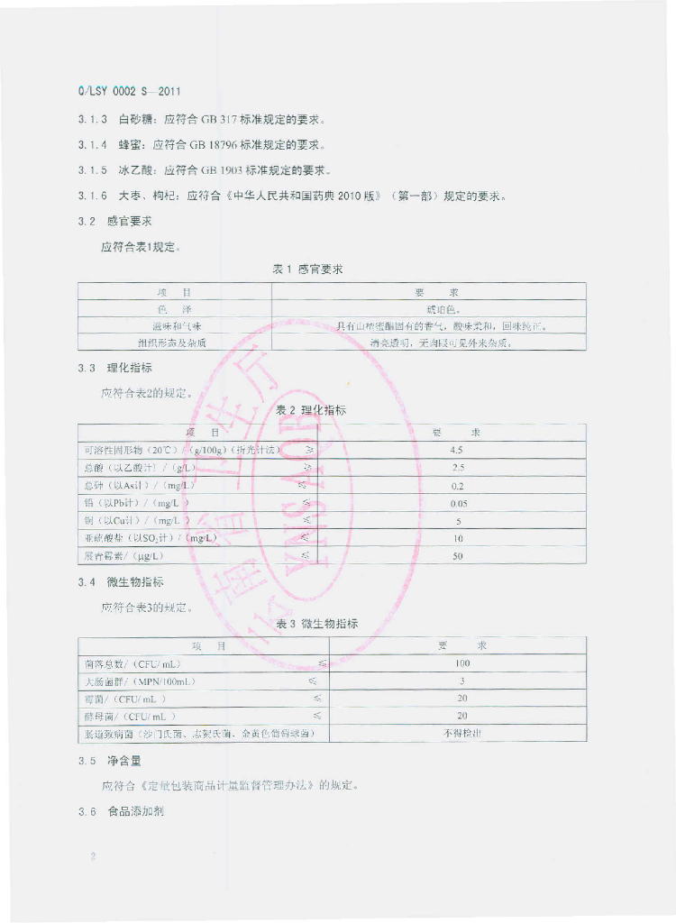 Q/LSY 0002S-2011 山楂蜜醋饮料