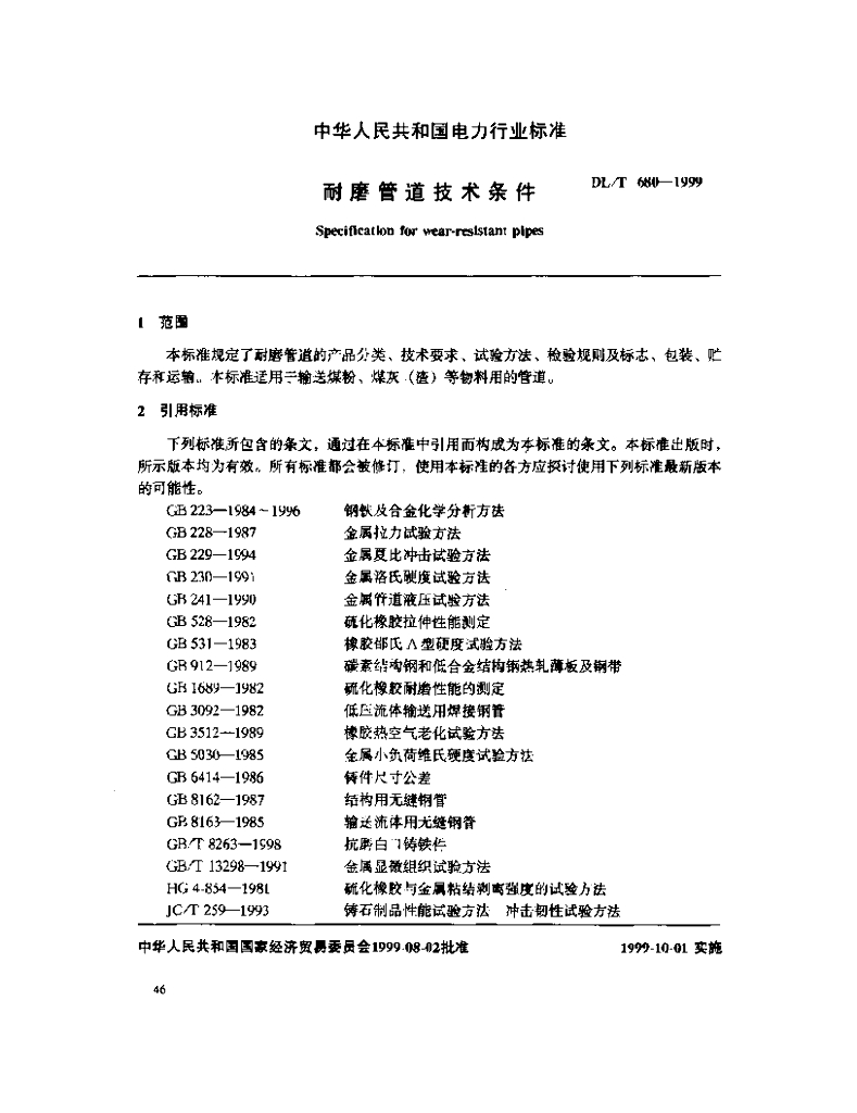 DL/T 680-1999 耐磨管道技术条件