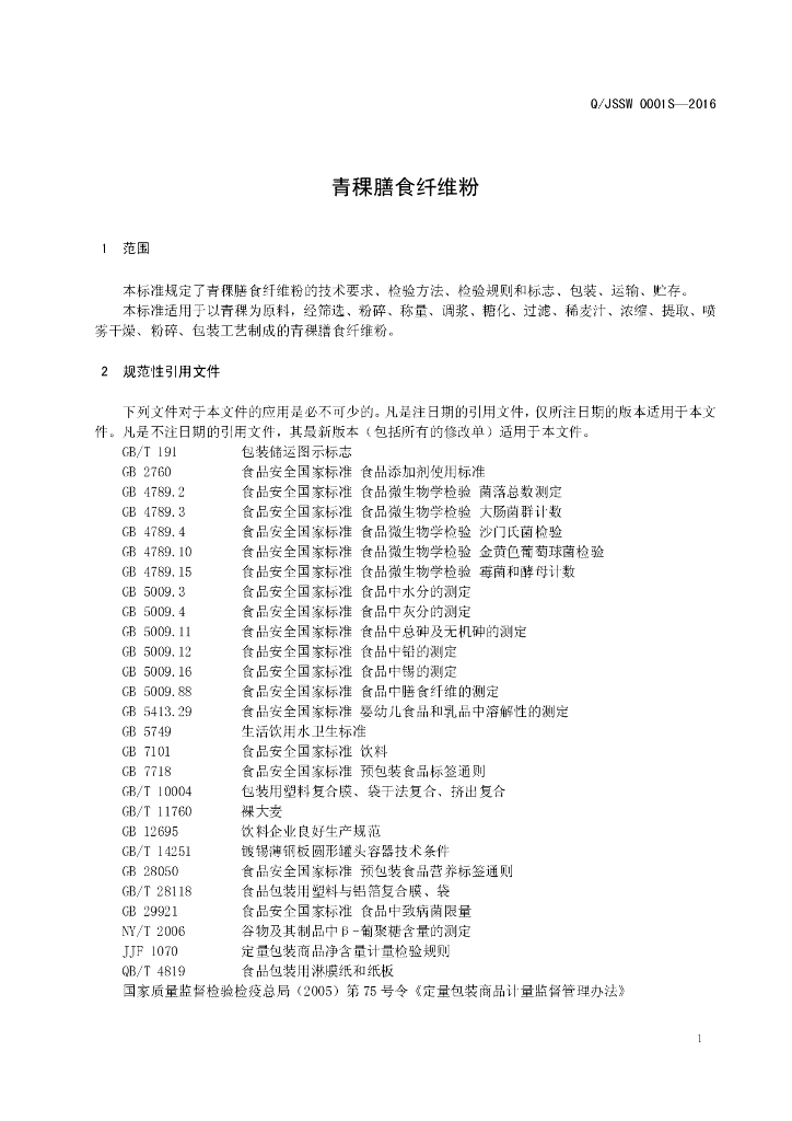 Q/JSSW 0001S-2016 西安极穗生物科技有限公司 青稞膳食纤维粉