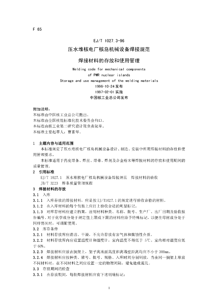 EJ/T 1027.3-1996 压水堆核电厂核岛机械设备焊接规范 焊接缺陷的补焊焊接材料的存放和使用管理