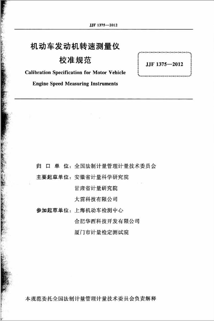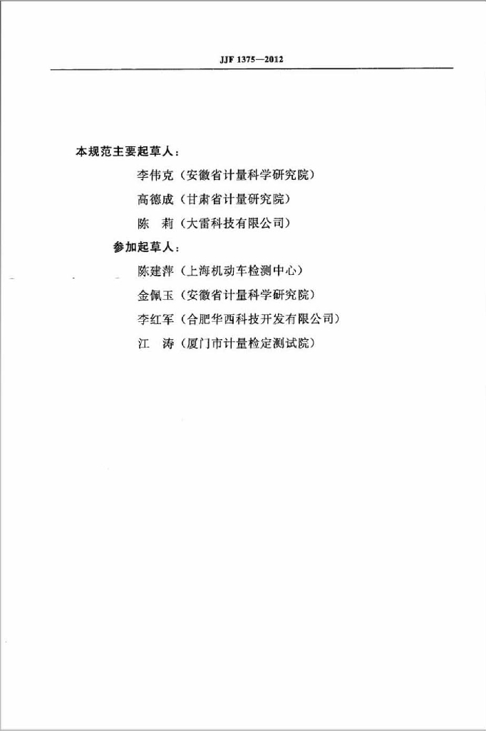 李伟克(安徽省计量科学研究院)、高德成(甘肃省计量研究院)、陈莉(大雷科技有限公司)、陈建萍(上海机动车检测中心)、金佩玉(安徽省计量科学研究院)、李红军(合肥华西科技开发有限公司)、江涛(厦门市计量检定测试院)