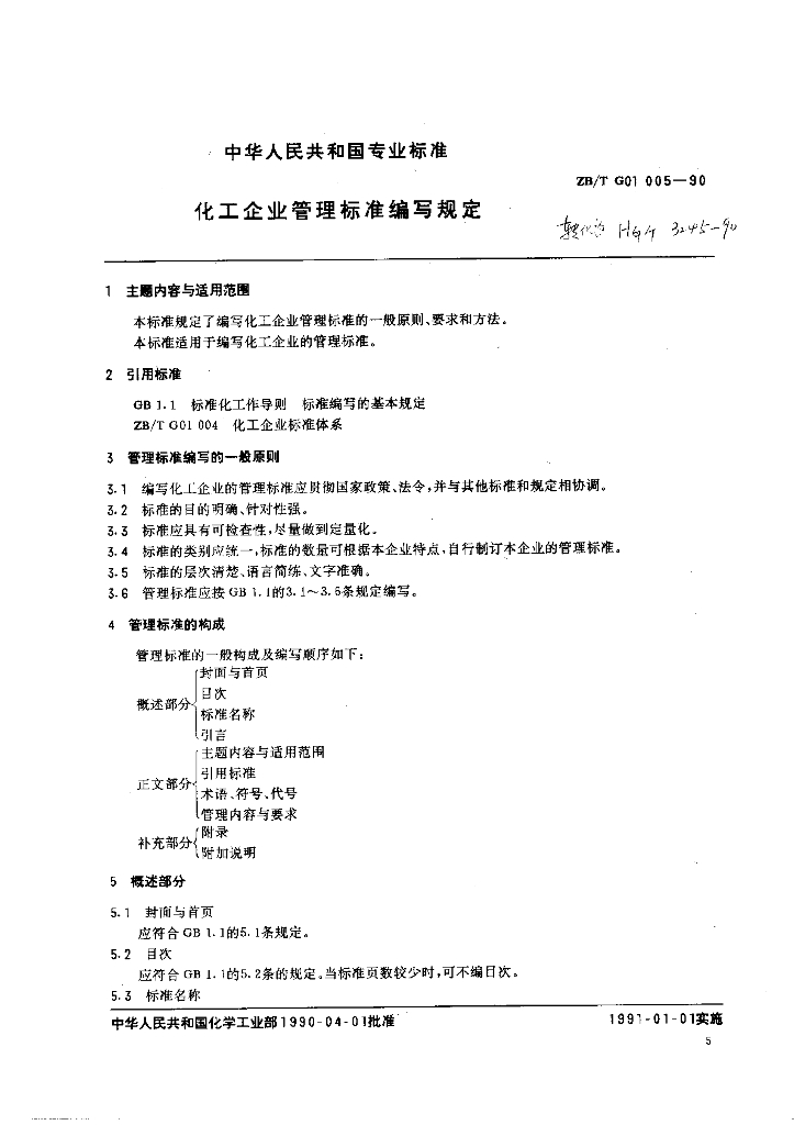HG/T 3245-1990 化工企业管理标准编写规定