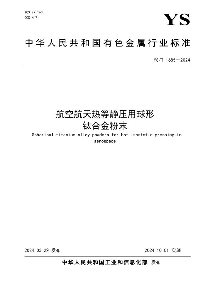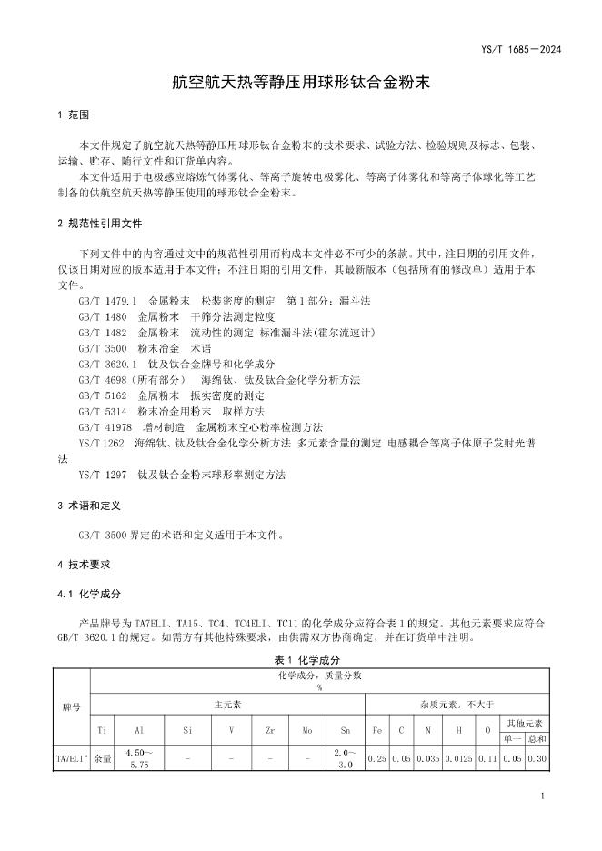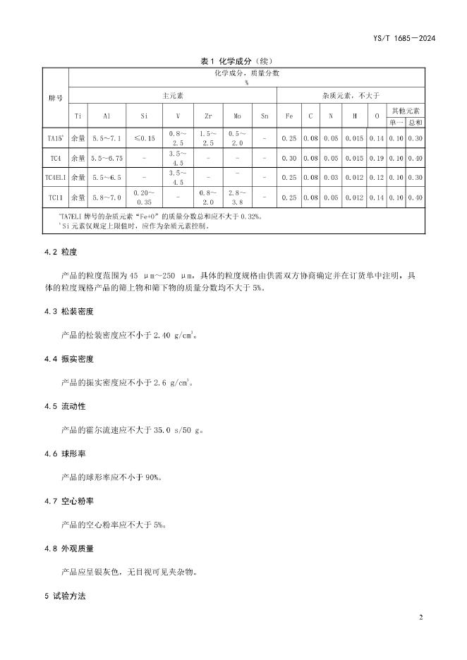 YS/T 1685-2024 航空航天热等静压用球形钛合金粉末