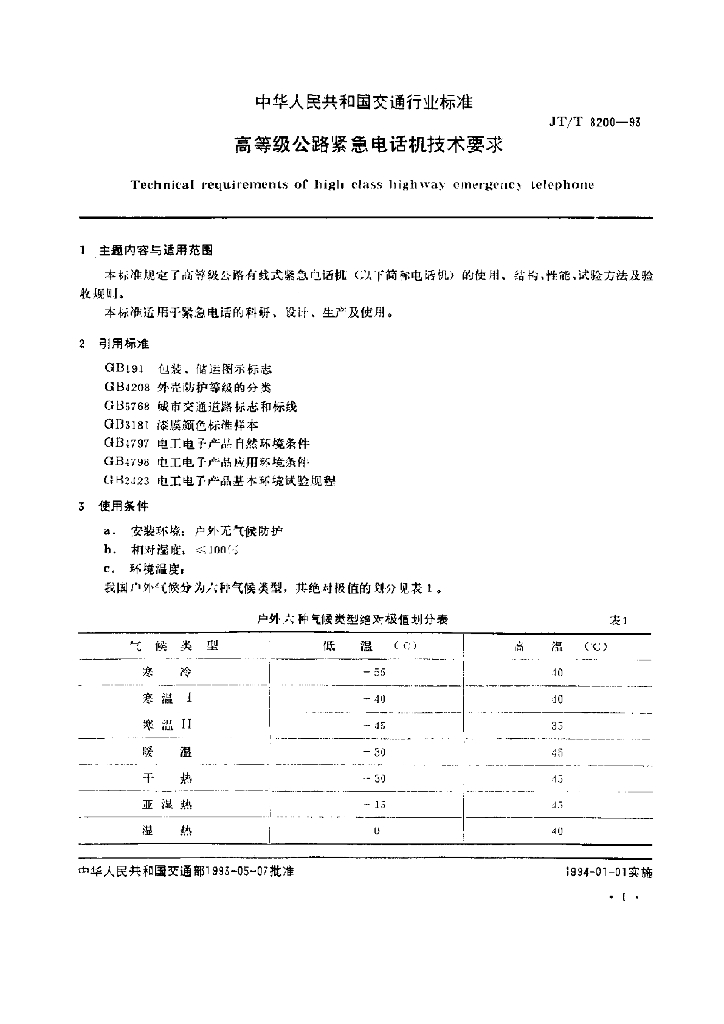 JT/T 8200-1993 高等级公路紧急电话机技术要求