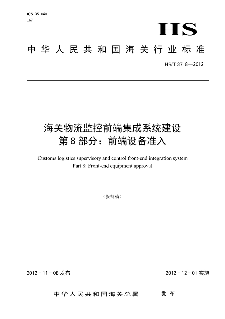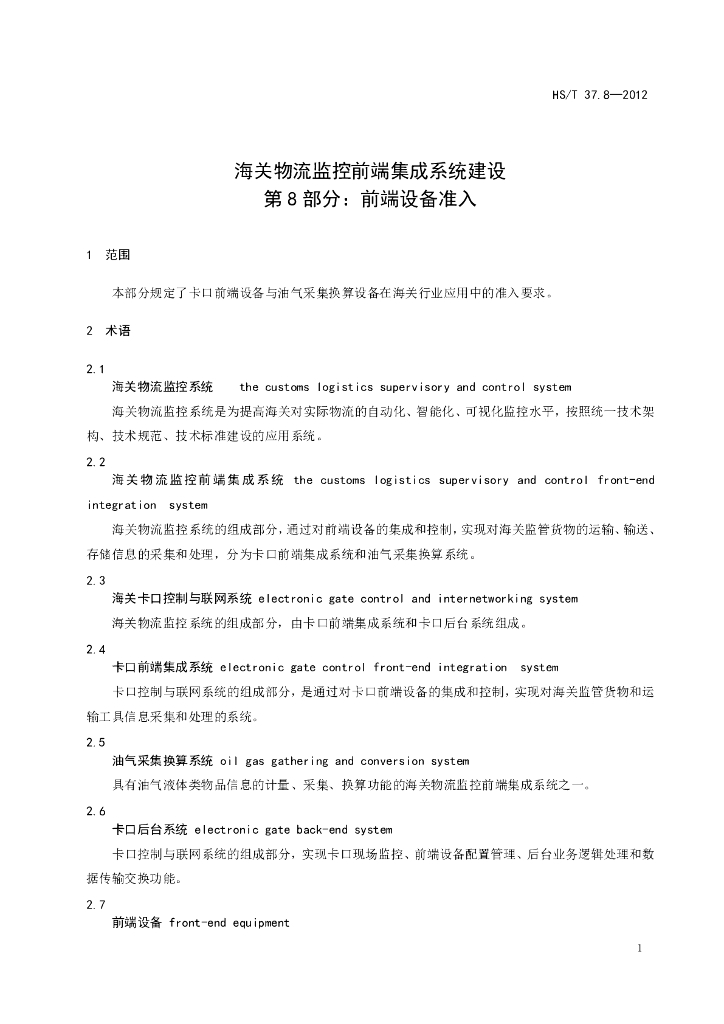 HS/T 37.8-2012 海关物流监控前端集成系统建设 第8部分:前端设备准入(报批稿)