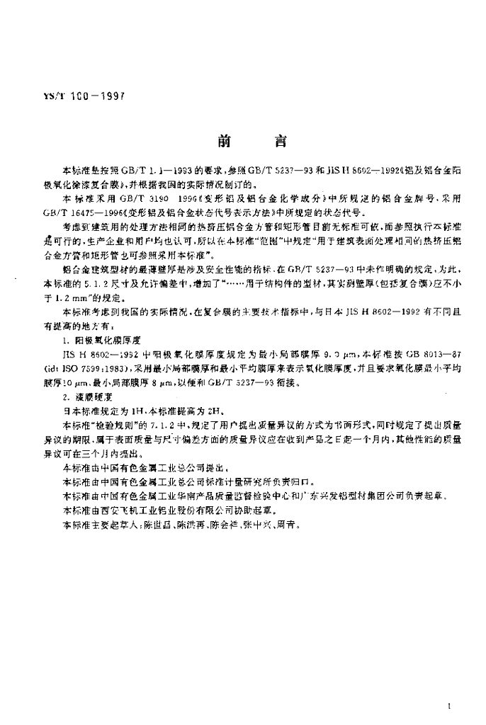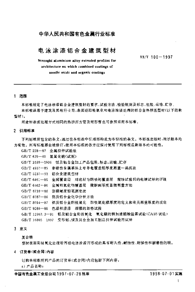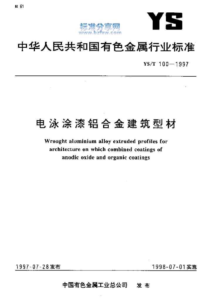 YS/T 100-1997 电泳涂漆铝合金建筑型材
