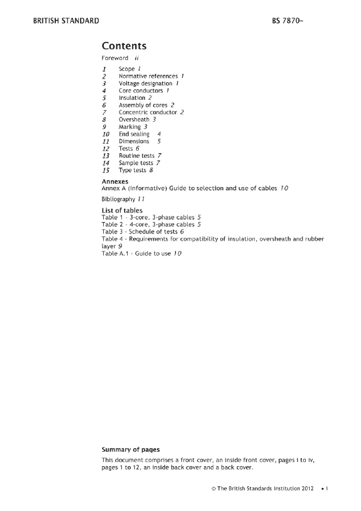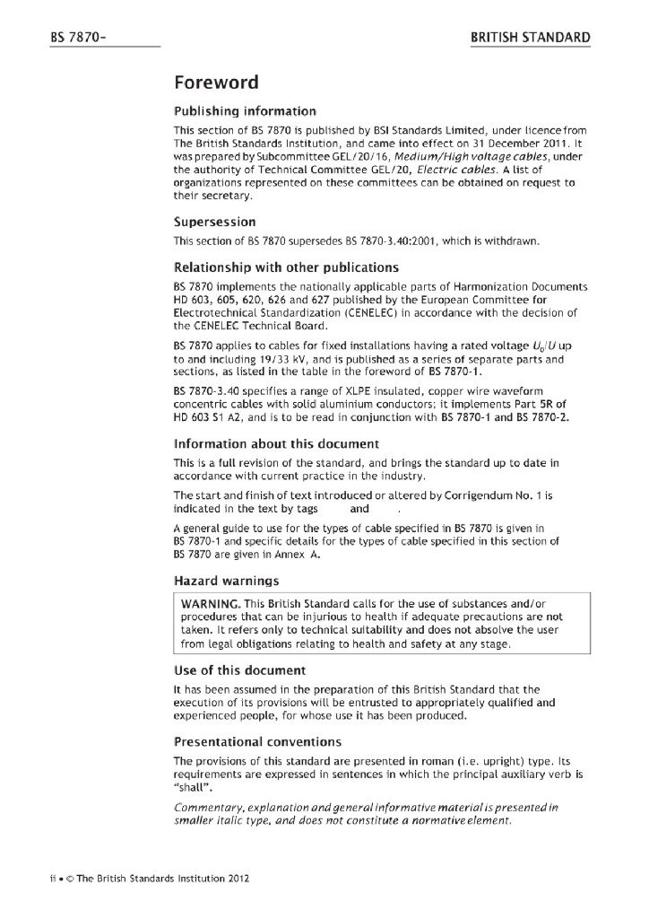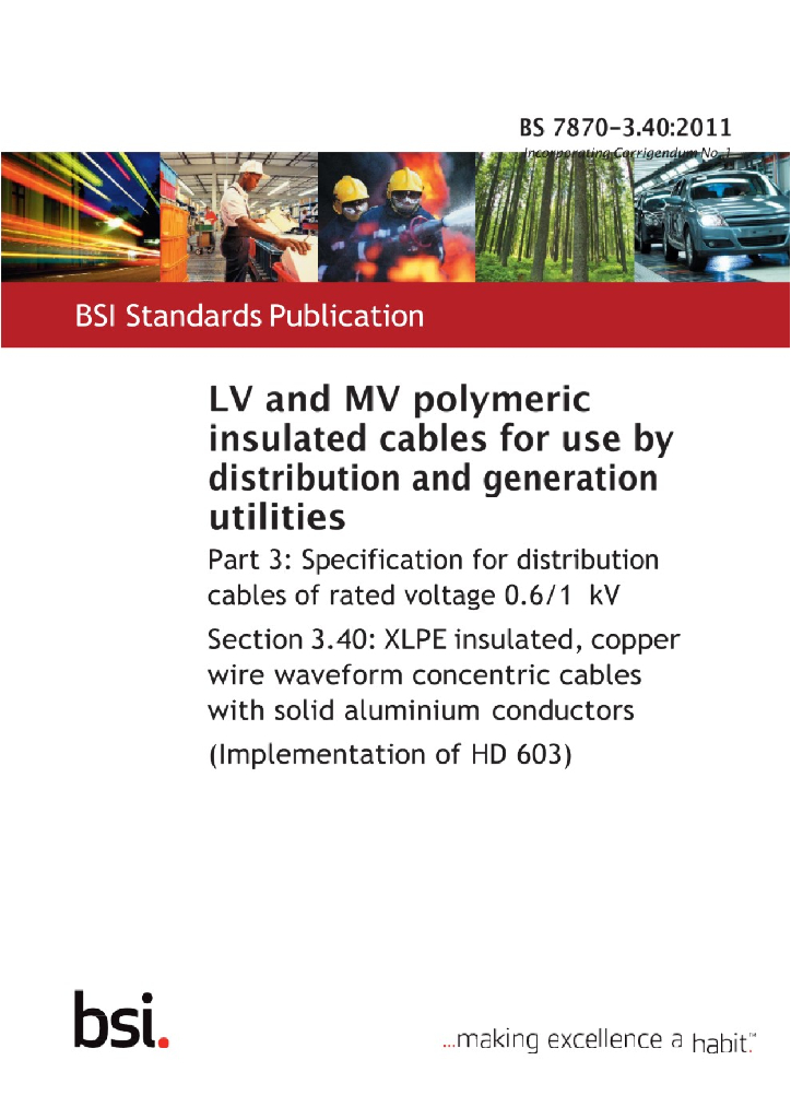 BS 7870-3.40:2011 用于配电和发电设备的低压和中压聚合物绝缘电缆 3部分:额定电压为0.6 1KV配电电缆规格 第3.40节:交联聚乙烯绝缘铜导线实心铝导体波形同心电缆