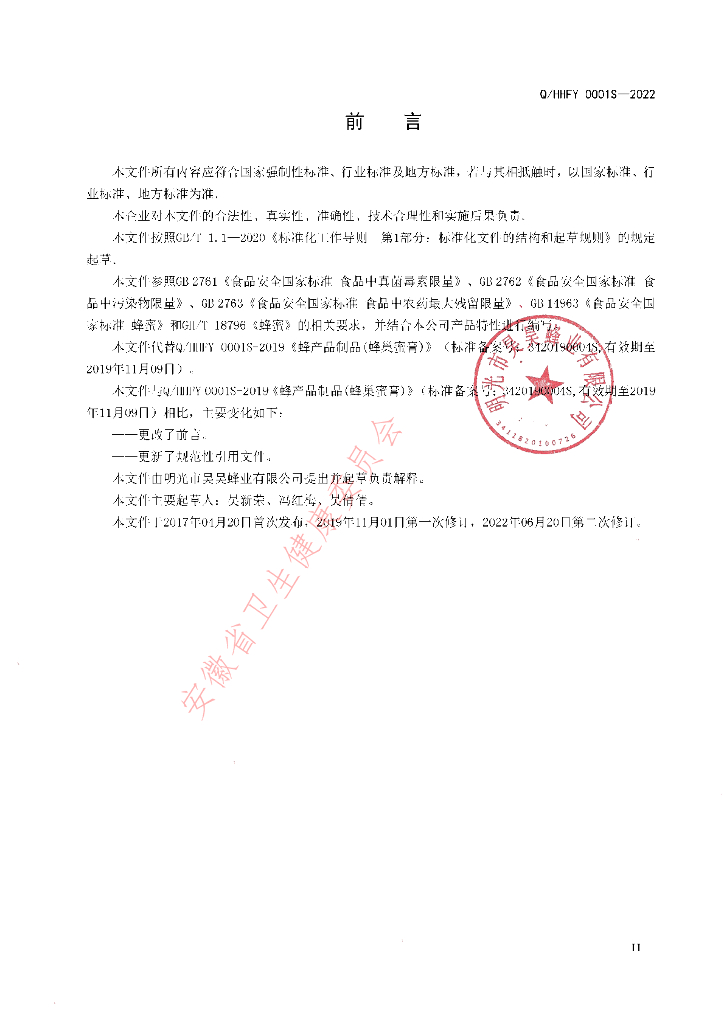 Q/HHFY 0001S-2022 蜂产品制品(蜂巢蜜膏)