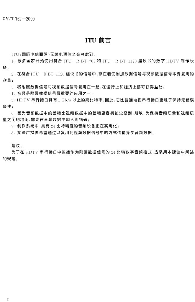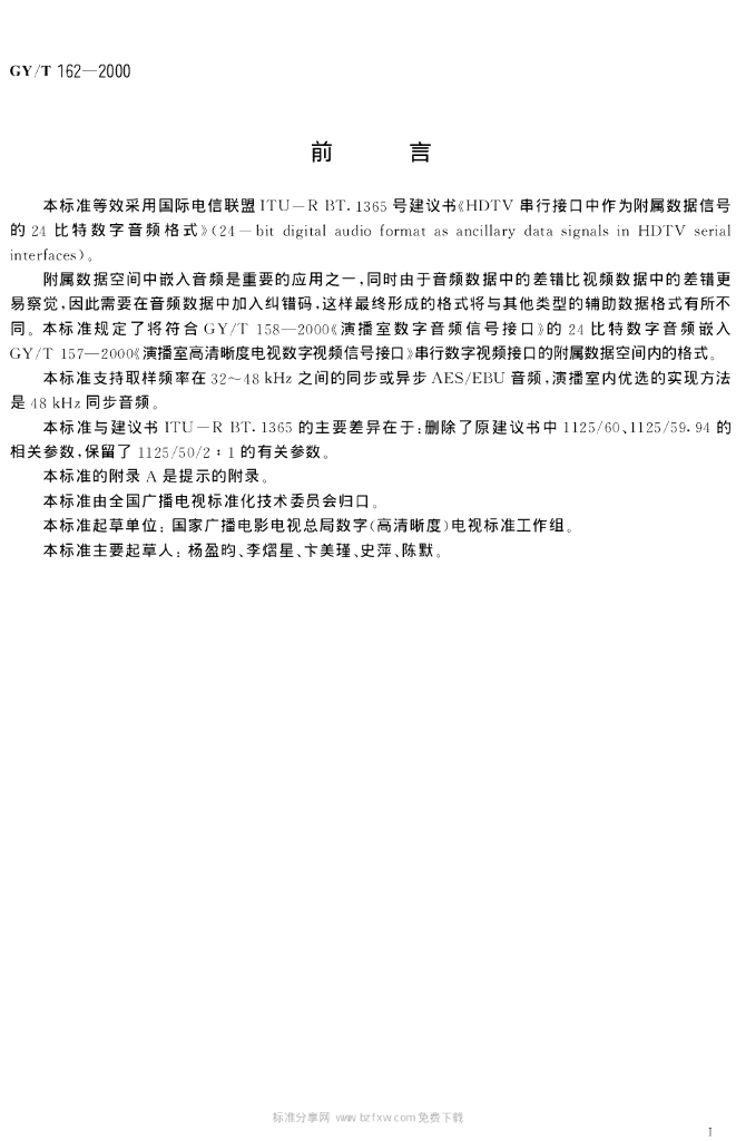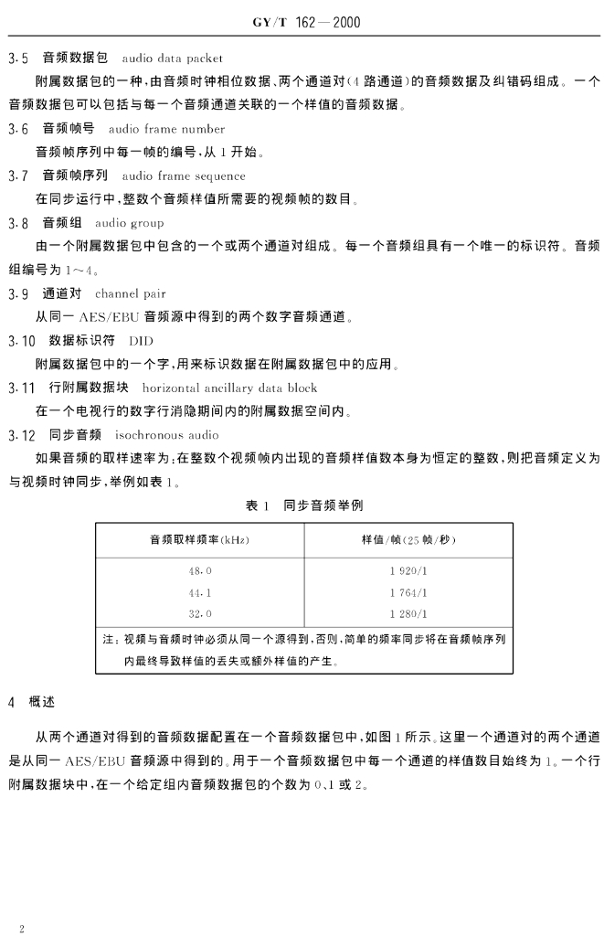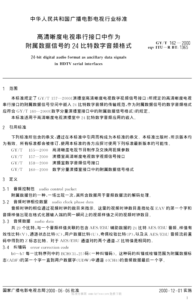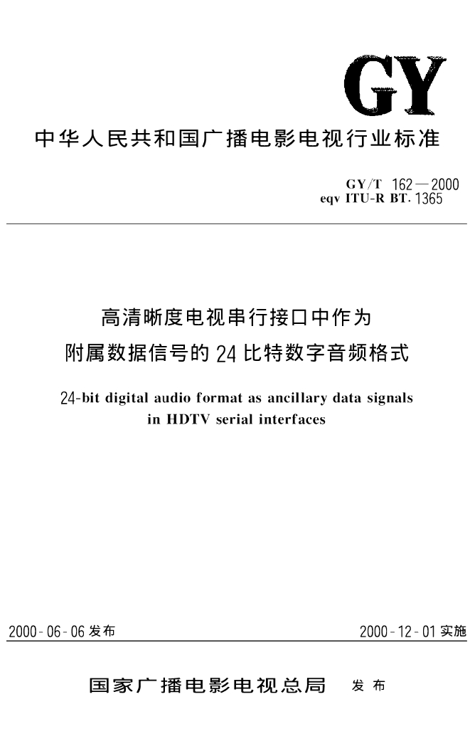 GY/T 162-2000 高清晰度电视串行接口中作为附属数据信号的24比特数字音频格式