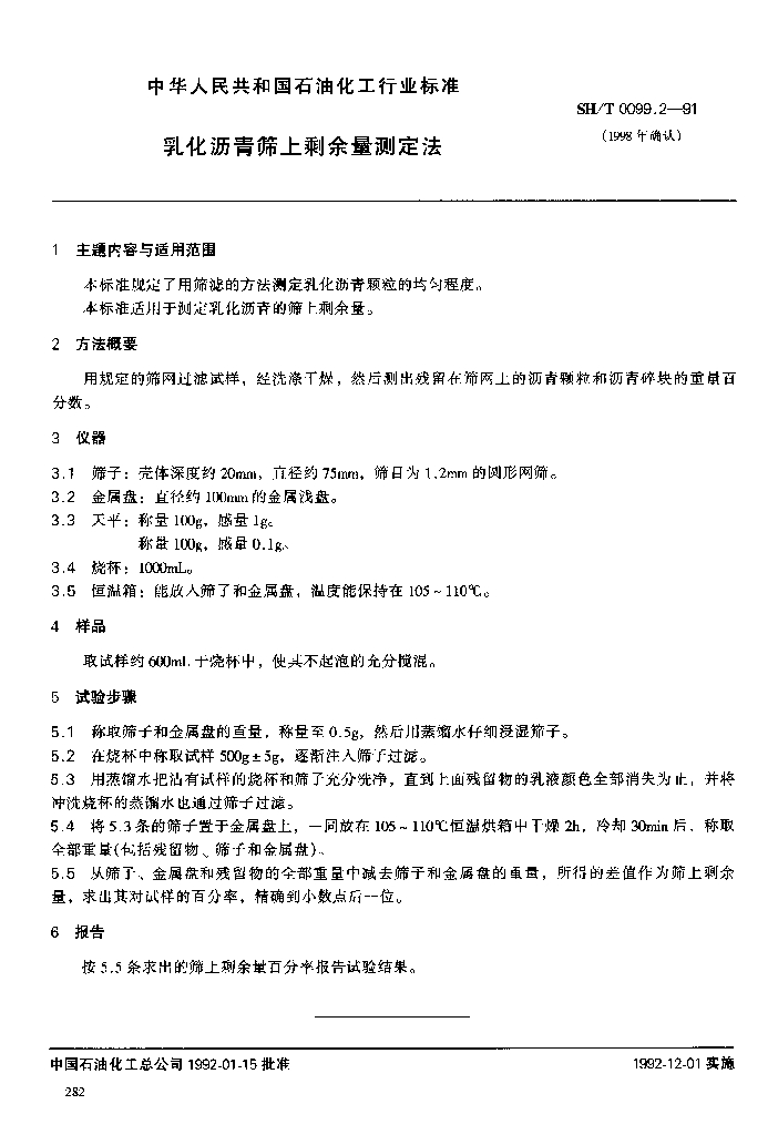 SH/T 0099.2-1991 乳化沥青上剩余量测定法