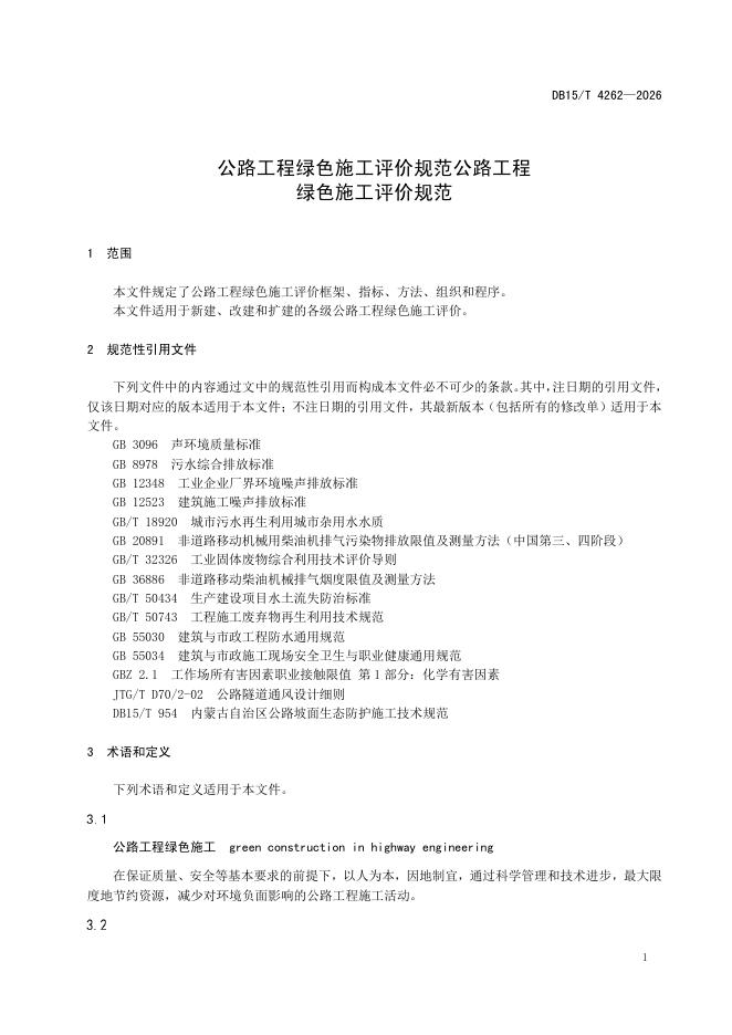 DB15/T 4262-2026 公路工程绿色施工评价规范