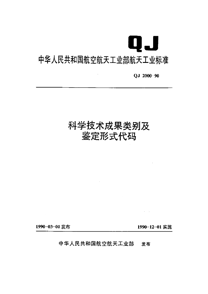 QJ 2000-1990 科学技术成果类别及鉴定形式代码